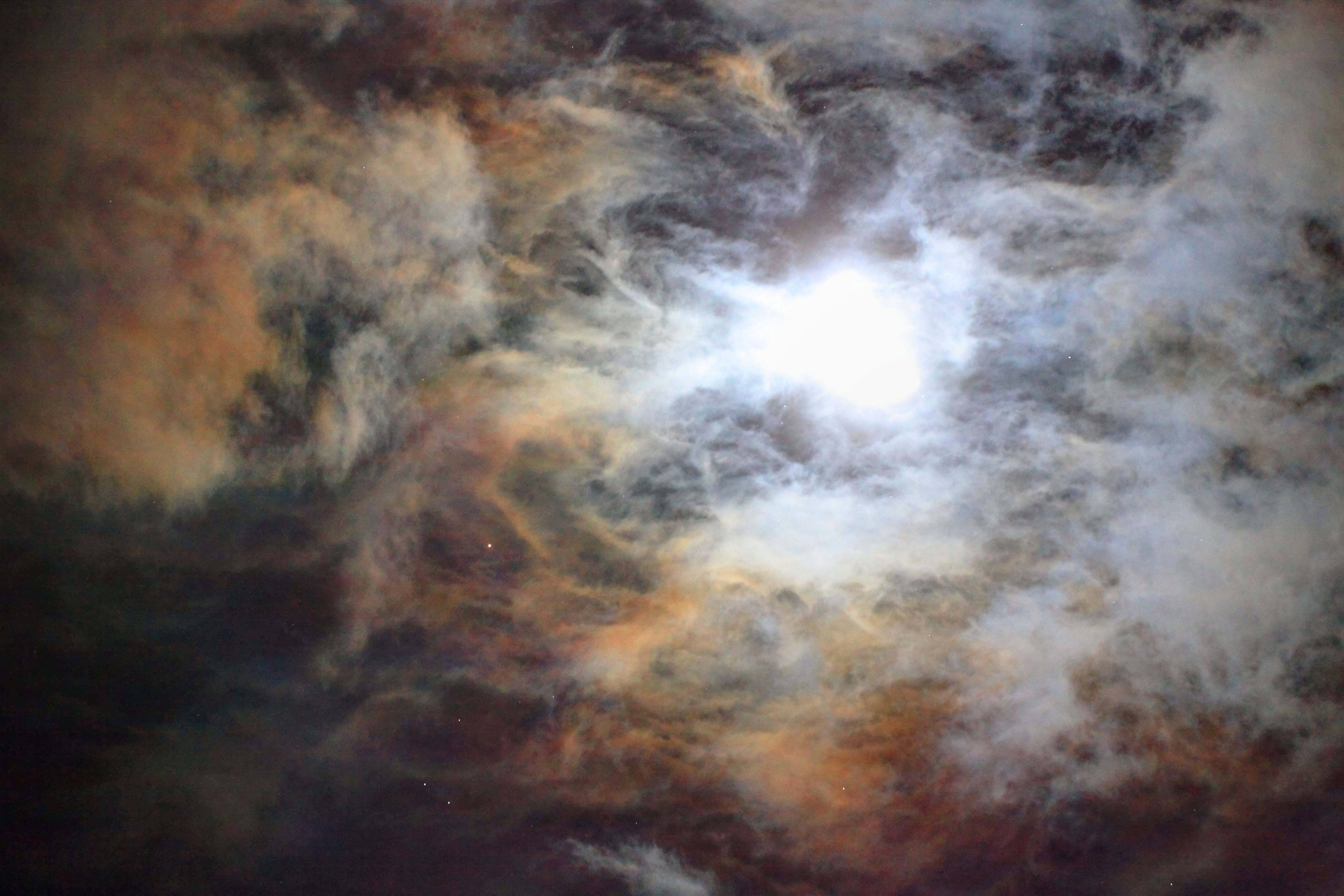 Als sich in der Nacht vom 4. auf den 5. September 2015 der Mond Aldebaran näherte, zogen Wolken auf. Glücklicherweise stellte sich ein faszinierendes Farbenspiel um den Mond ein, so dass die Konjuktion eine ganz besondere Aura bekam.
