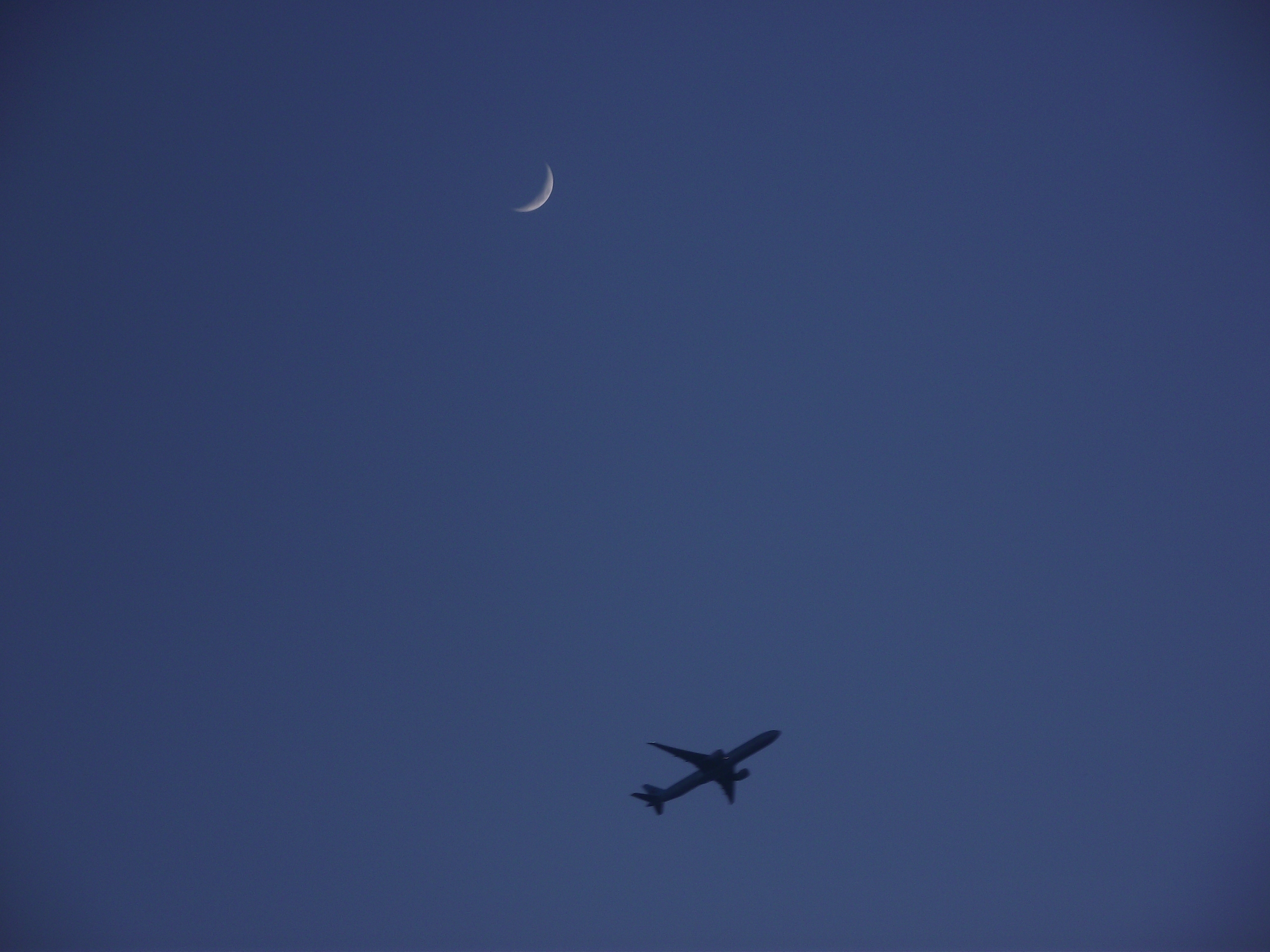 Unterhalb der Mondsichel flog am Abend den 7.5.2011 ein Flugzeug vorbei. Das Flugzeug ist ein bisschen größer als der Mond. Die Sonne ist schon untergegangen.