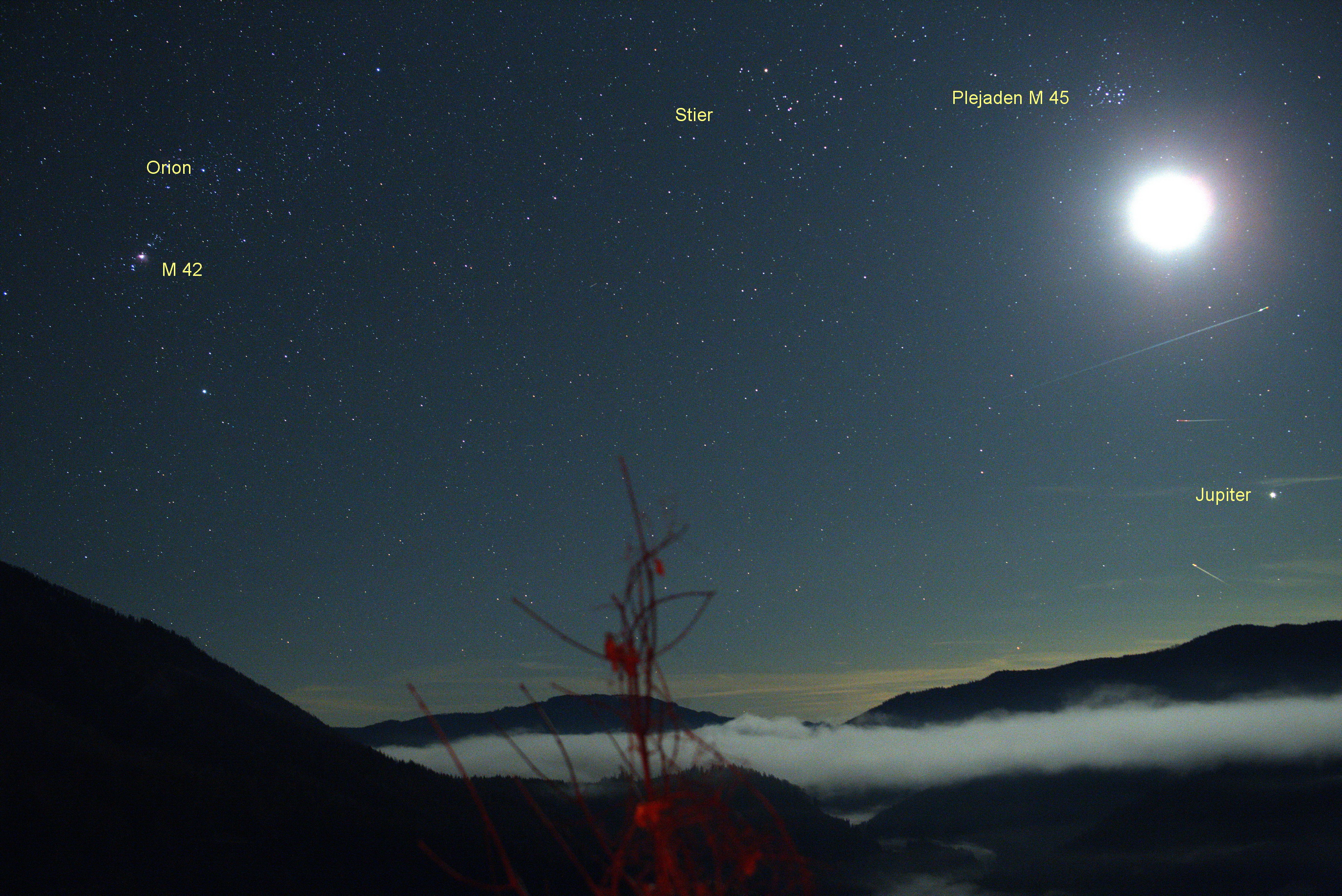 Am Abend des 14. März 2024 habe ich mit einer transportablen Montierung und optischer Ausrüstung eine kleine Exkursion gemacht, um den Kometen 12P/Pons-Brooks zusammen mit der Dreiecksgalaxie M 33 in einem Bild zu verewigen. Noch störte der Mond nicht sehr, der zusammen mit Jupiter den Westhimmel beherrschte. Die Plejaden über dem Mond und das Sternbild Orion am linken Rand ergaben eine schöne Stimmung.