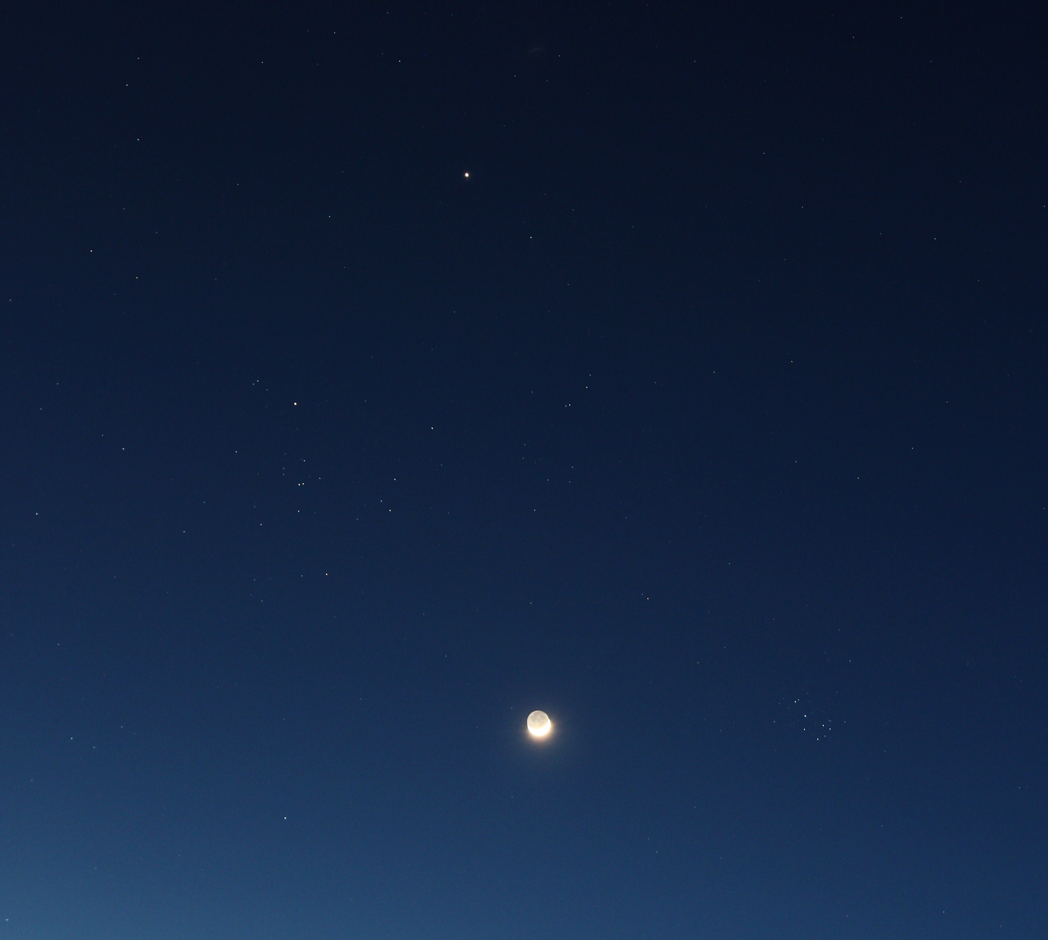 Am 13. April 2013 gab es eine schöne Himmelslandschaft im Sternbild Stier: Mond (überbelichtet, mit aschgrauem Mondlicht) und Jupiter im Sternbild Stier mit den Sternhaufen der Hyaden und Plejaden.