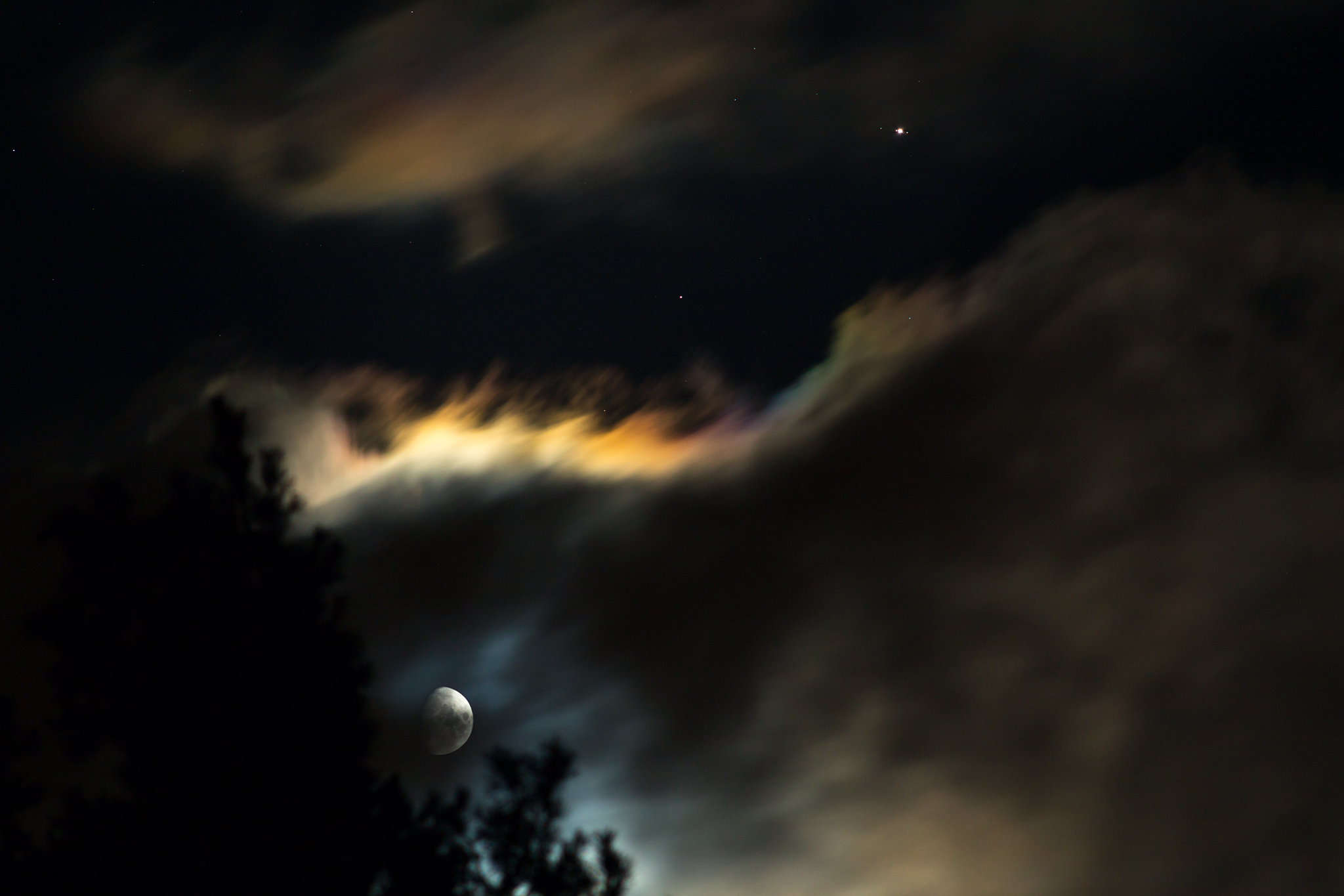 Mond und Jupiter mit 5,7 Grad Abstand inmitten irisierendem Stratocumulus. Der helle Stern zwischen Mond und Jupiter ist Deneb Algedi (+ 2.854 mag) oder Delta Capricornus. Auch drei von Jupiters Monden sind zu erkennen (v.l.n.r.): Kallisto, Ganymed und Europa. Io steht zu dicht am rechten Rand des Jupiter und ist nicht sichtbar.