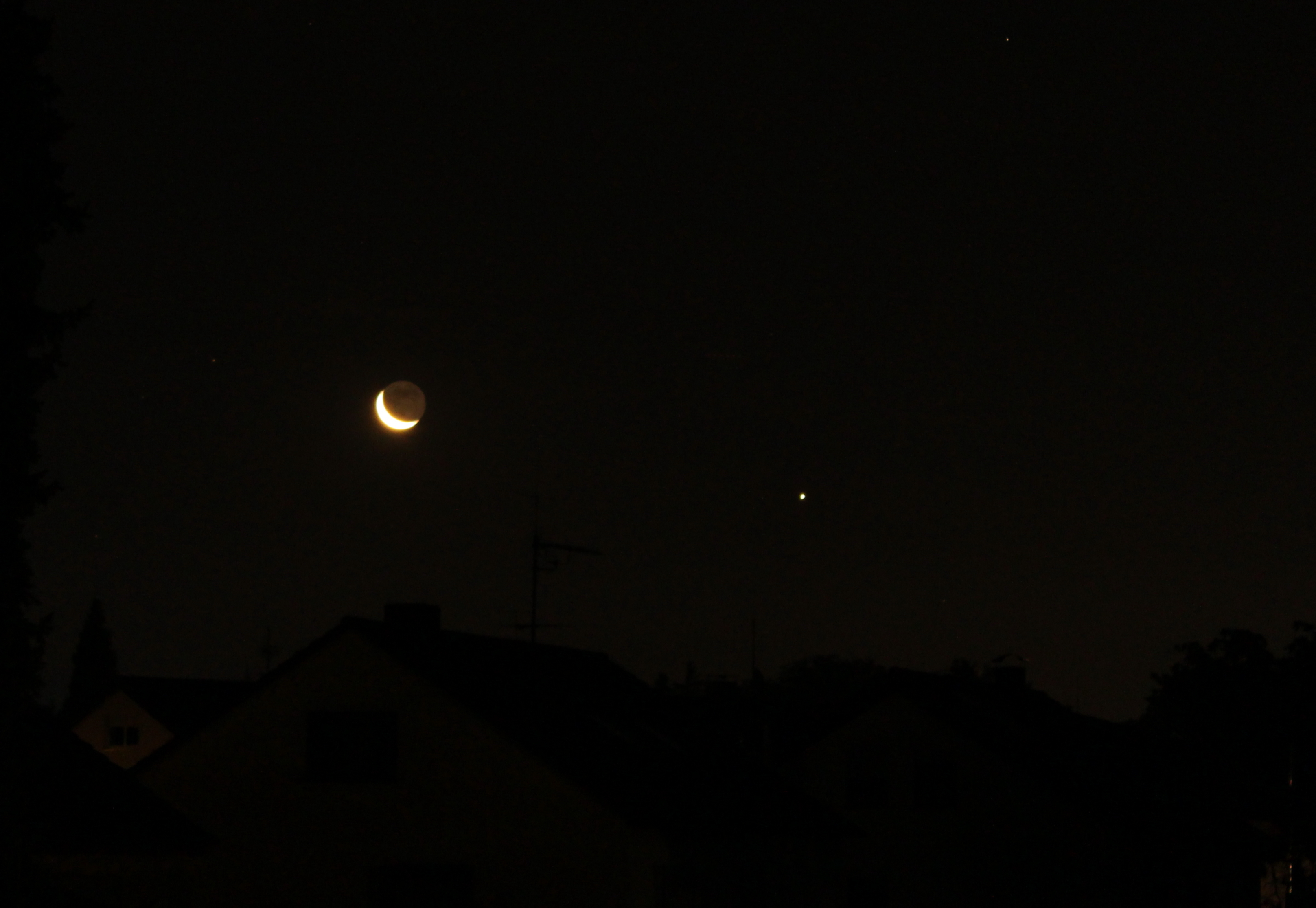 Mond und Jupiter kurz nach ihren Aufgängen über dem Sindelfinger Ortsteil Maichingen