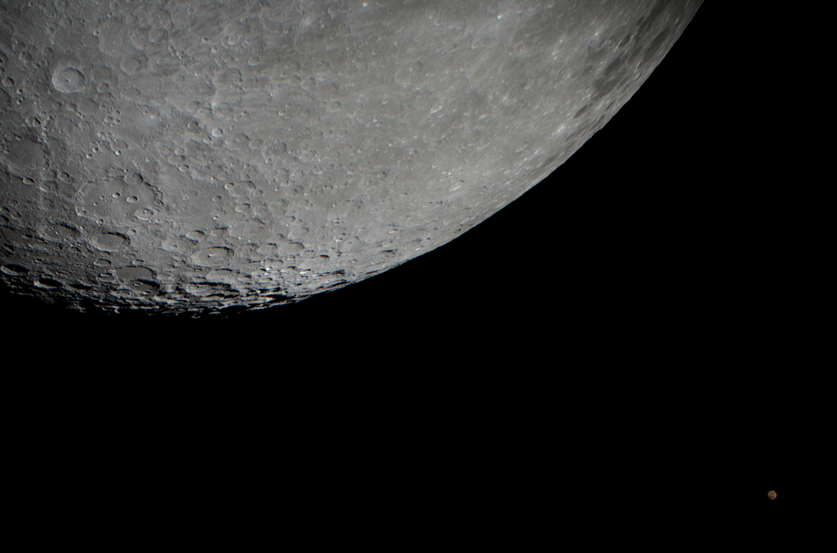 Am 9. Februar 2025 wollte ich eigentlich nur den Mars aufnehmen, da der Mond jedoch sehr nahe stand, habe ich das Aufnahmesetup etwas verändert, um auch den Mondrand mit sehen zu können. Um einen größeren Bereich aufnehmen zu können, wurde bei dieser Aufnahme eine Shapley-Linse benutzt, allerdings führt dies zu einer leichten Vignettierung zum Bildrand hin und einem leichten Farbfehler bei Mars.
