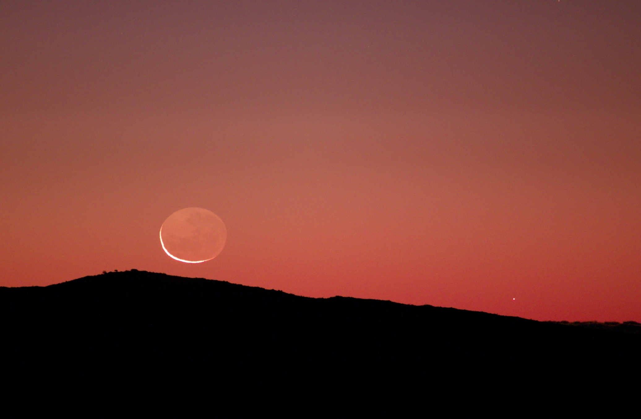 In der Abenddämmerung des 3. Januar konnte in Chile die Begegnung der knapp 1,3 Tage alten Mondsichel mit dem Planeten Merkur beobachtet werden. Beim Untergang berührten die beiden Himmelskörper fast gleichzeitig den bergigen Horizont.