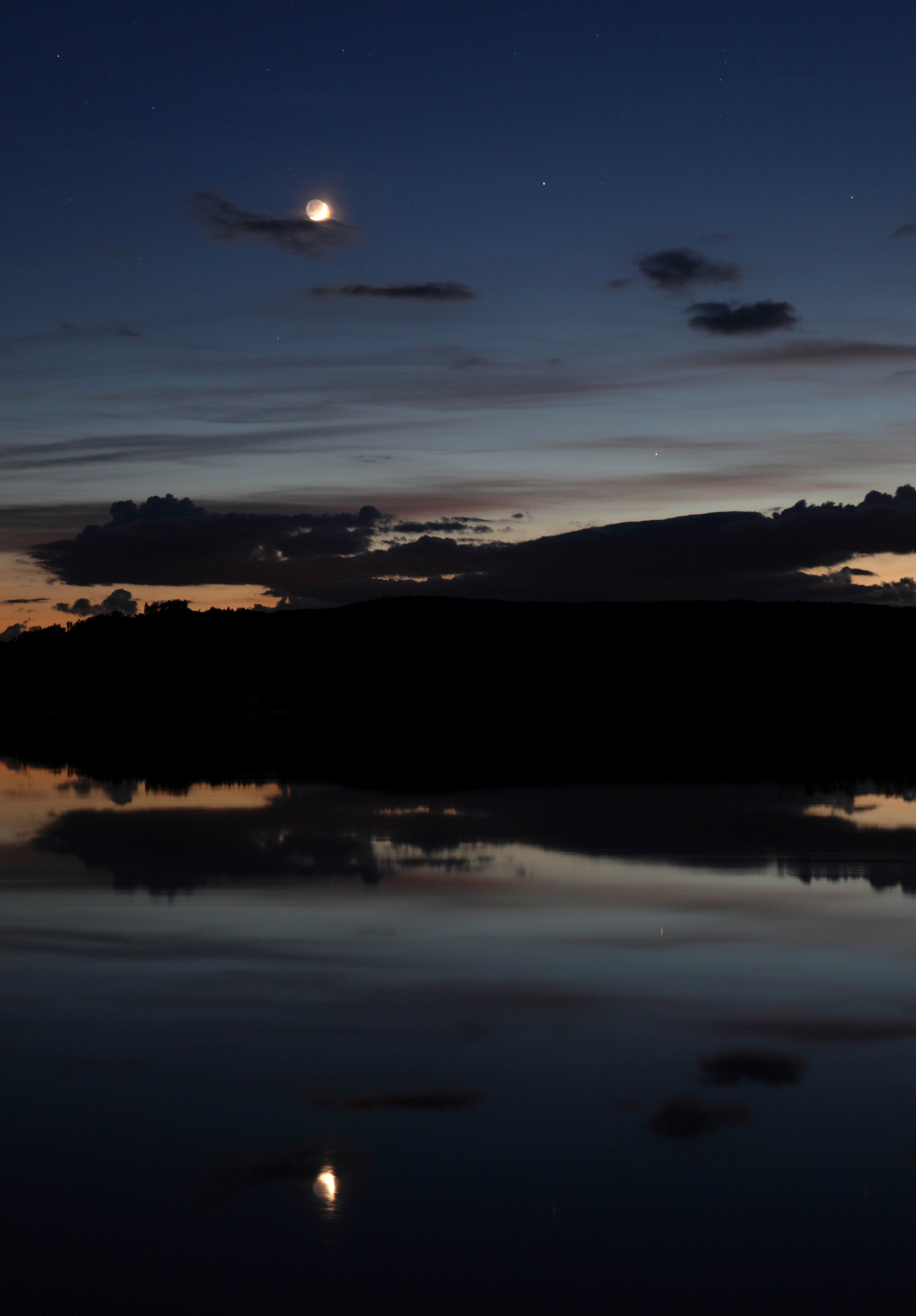 Leserbilder Astronomie: Mond und Merkur mit ihren Spiegelbildern im Inn-Stausee