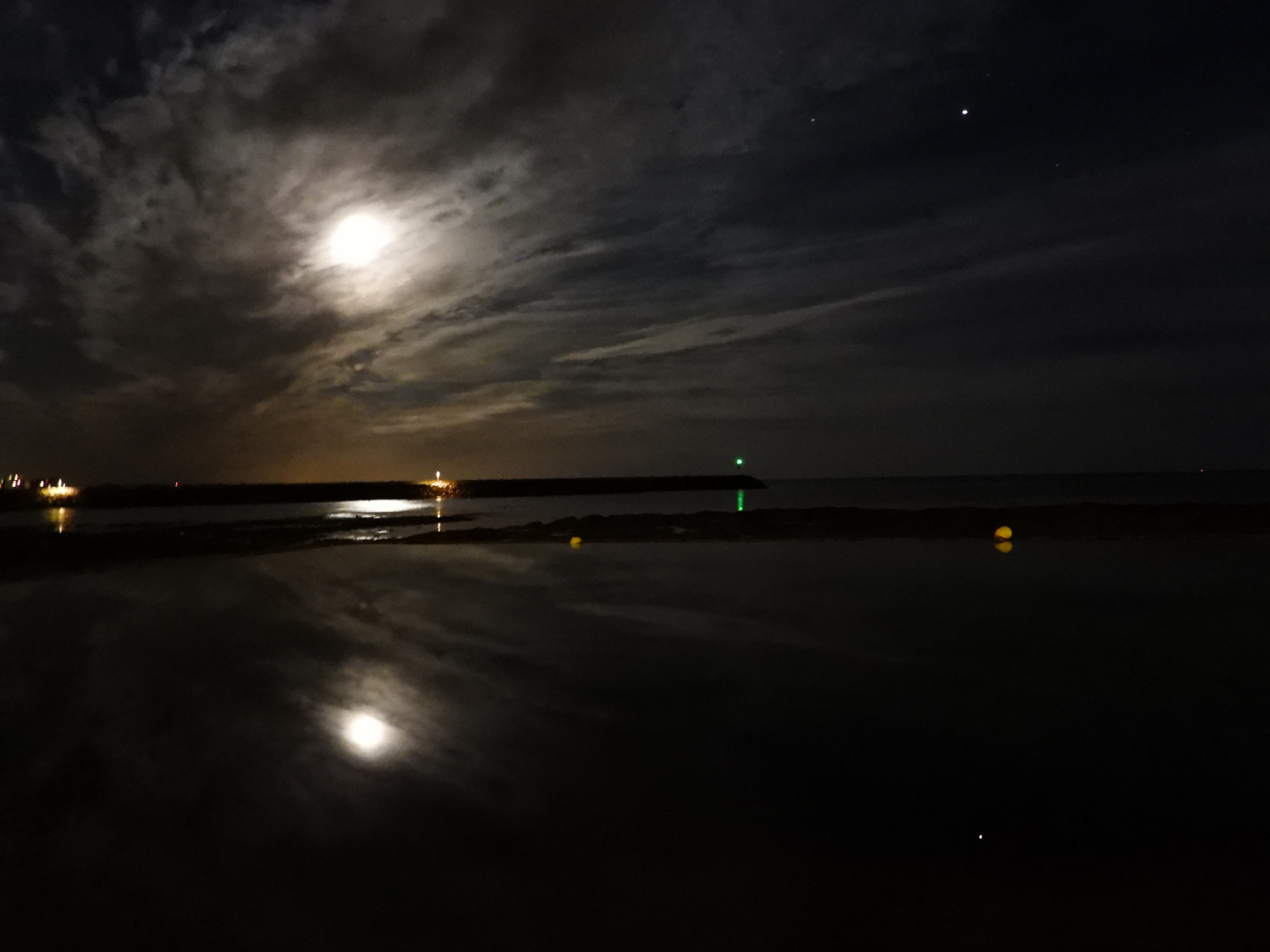 Der Mond hinter Wolken und die Planeten(Jupiter,Saturn) über dem Meer, die sich zusammen in einem Ebbe Schwimmbecken am Atlantik spiegeln.