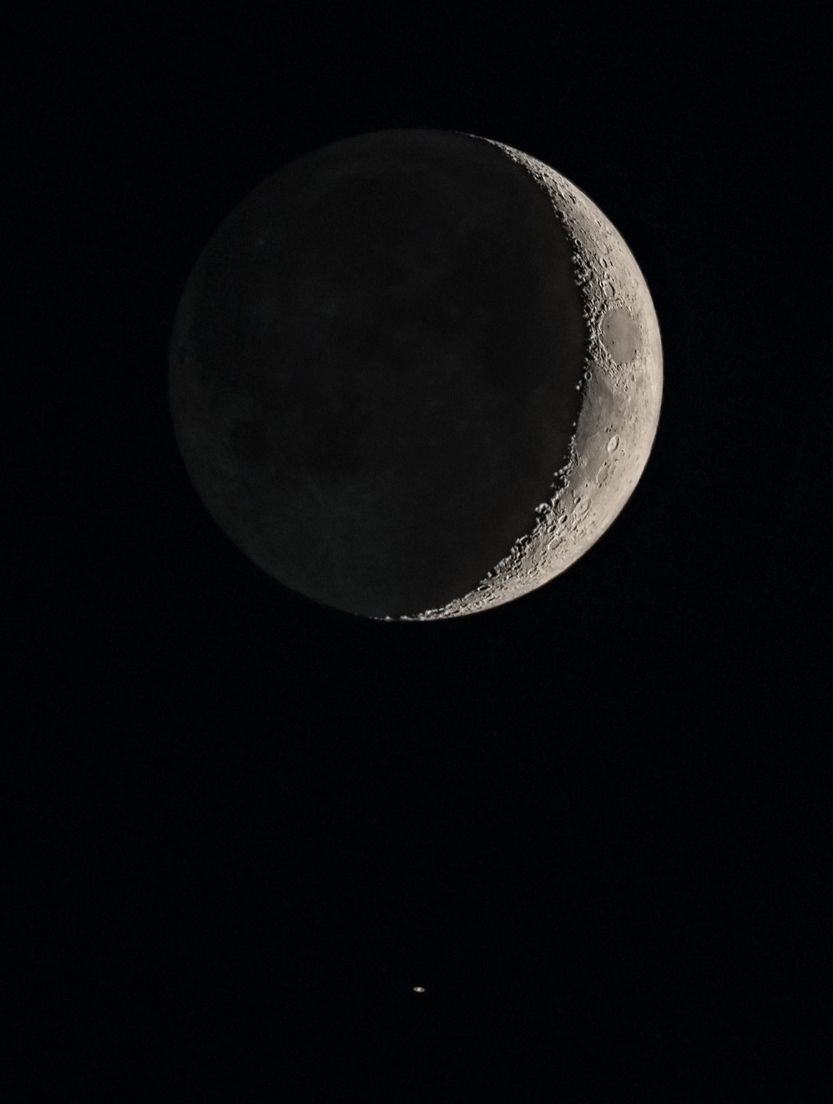 Mond und Saturn sind sich diesmal ziemlich nahe gekommen. Ich hatte großes Glück mit dem Wetter. Rund 30 Minuten vor Monduntergang haben sich die Wolken doch noch verzogen. In der tiefen Lage war das Seeing natürlich schon sehr schlecht. Es war auch nicht mehr viel Zeit für die Aufnahme. Ich habe drei unterschiedliche Belichtungen für Mond, Erdschein und Saturn gemacht. Aus rund 200 Bildern habe ich jeweils die besten zehn gestackt und dann in Photoshop zusammengesetzt.