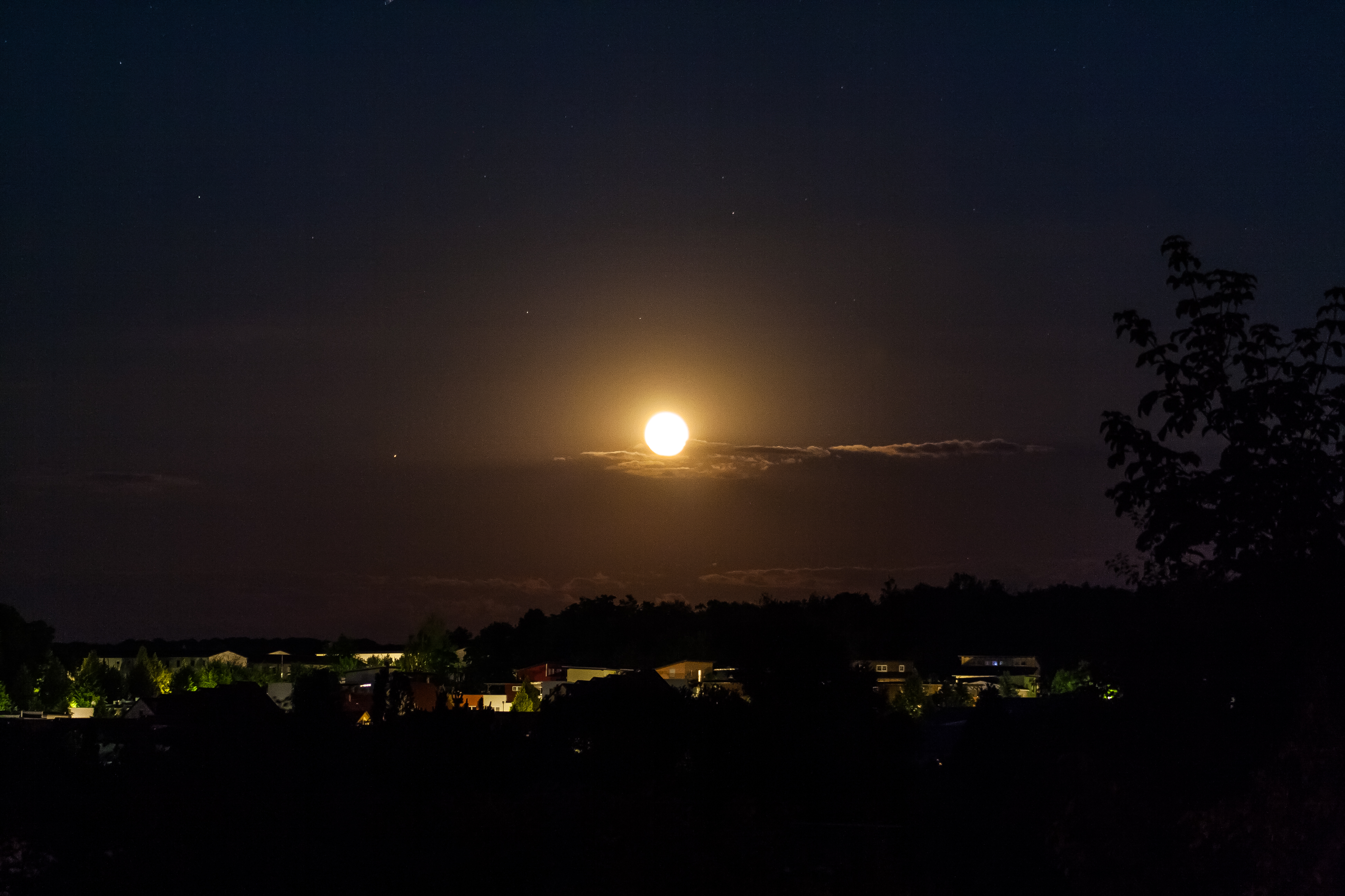 Nach dem das Treffen von Merkur und Mars durch Wolken im Nordwesten verborgen blieb, wendete ich mich der bevorstehenden Konjunktion von Mond und Saturn zu. Am Dienstagabend gingen beide gemeinsam auf und waren noch 3,3° von einander entfernt. Eine nette Konstellation die eine kleine Entschädigung bot. [Sonnenhöhe: -11,0°] (Mittwochmorgen waren sie dann bei nur noch 1,3° von einander entfernt)