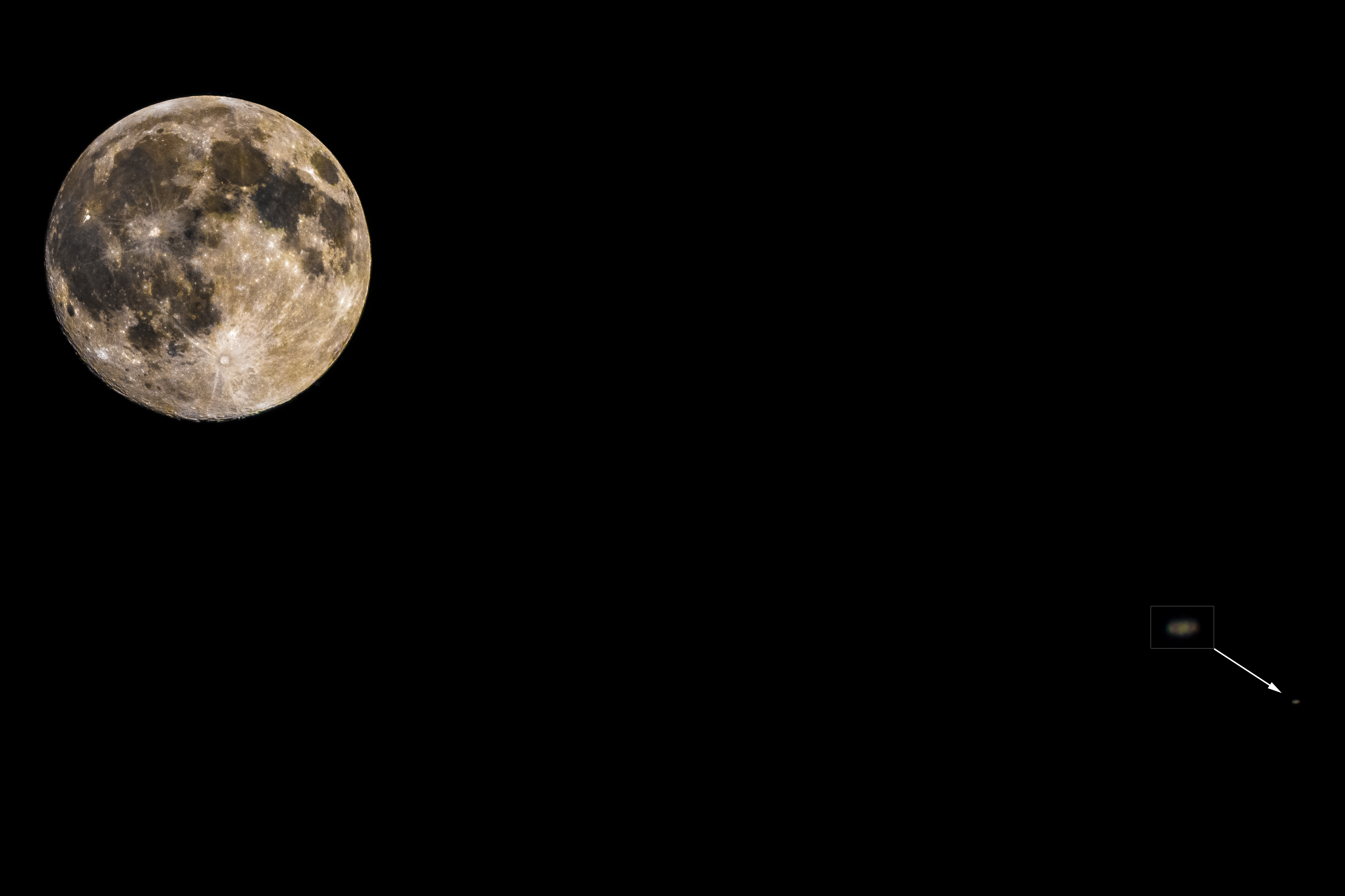 Eine HDR-Aufnahme aus sieben sukzessiven Einzelbildern für einen starken Kontrast beim Mond, wobei ich für Saturn ein Einzelbild (1/100 s) mit Mond und Saturn aufnahm, um dessen Strukturen durch die Überlagerung nicht zu verwaschen.