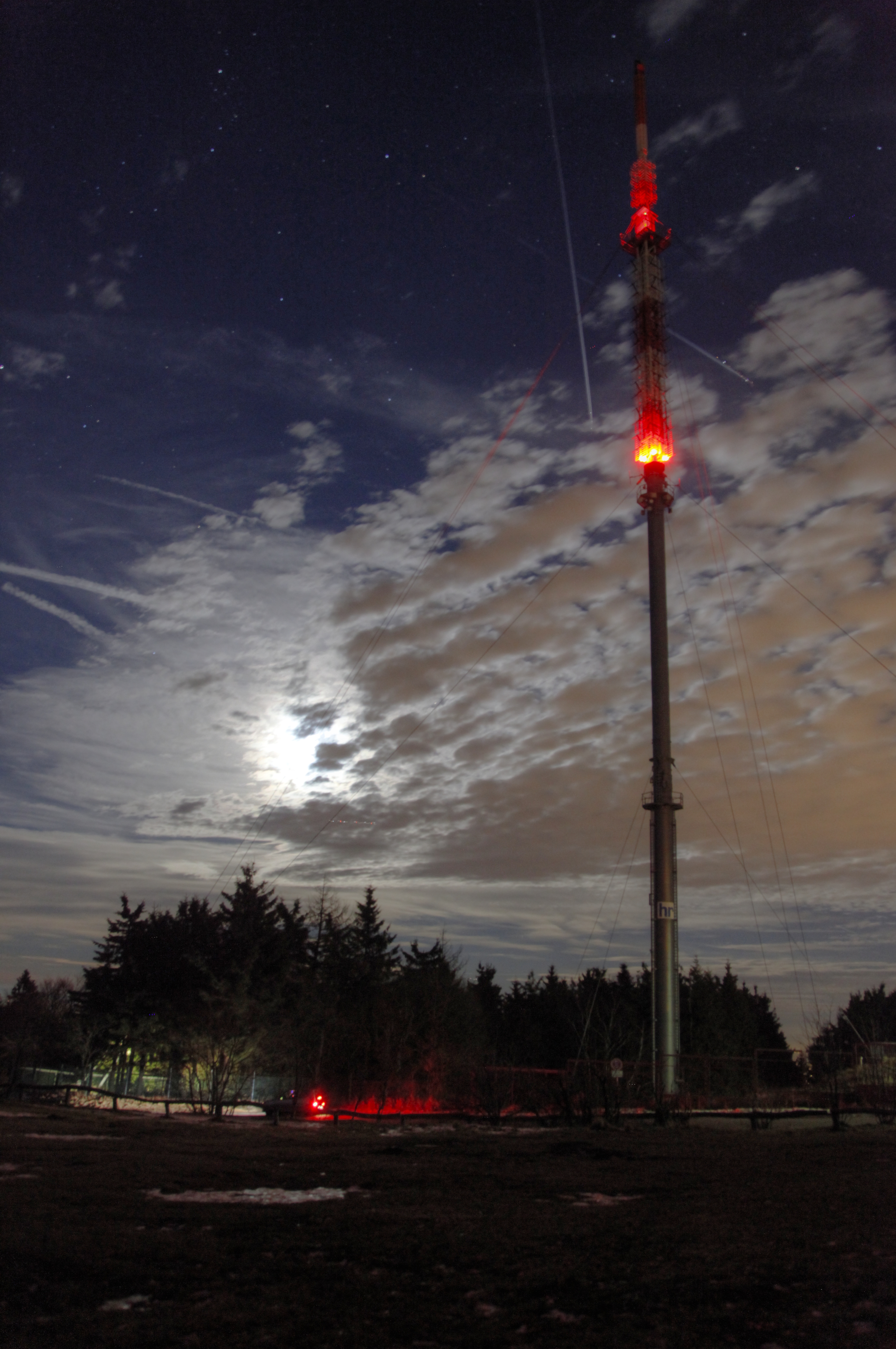 Am Abend des 16. Dezember 2013 wollte ich versuchen, den Kometen Lovejoy vom Großen Feldberg im Taunus aus zu fotografieren. Leider zogen Wolken genau dann auf, als ich fertig aufgebaut hatte. Der aufgehende Vollmond bot mit Stratokumulus und Zirrostratus allerdings einen sehr schönes Anblick hinter dem Rohrmast des Hessischen Rundfunks, dem mit 116,17 Meter höchsten Bauwerk auf dem Feldberg.