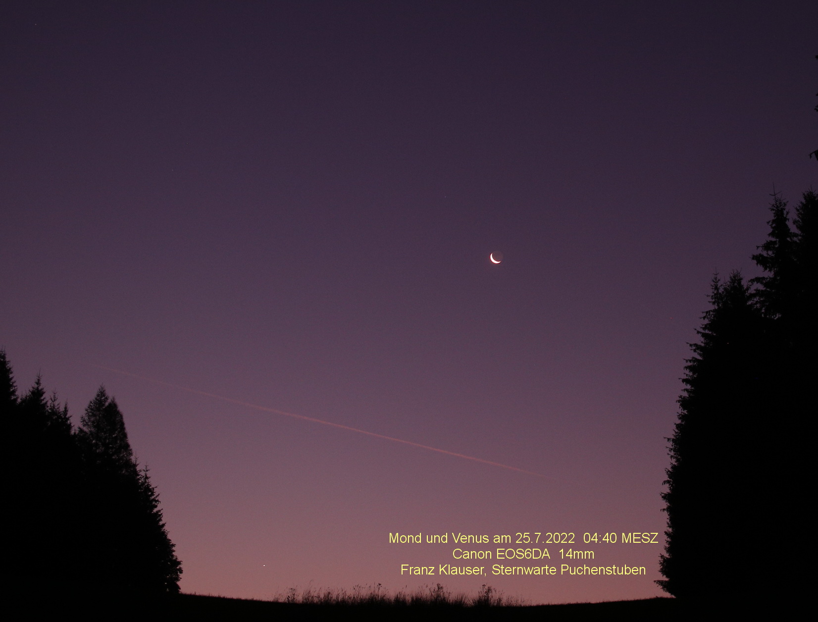 Nach einer durchwachten astronomischen Nacht boten Mond und Venus ein Stimmungsbild am Osthimmel, schon in der Morgendämmerung.