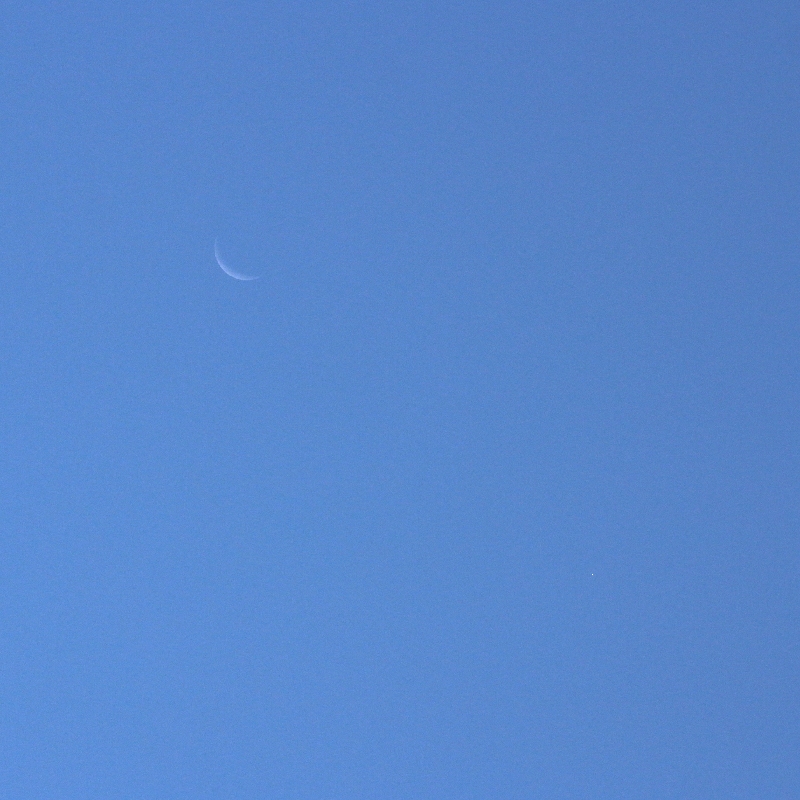 Nach der schönen Konjunktion von Mond und Venus mit Praesepe am Morgenhimmel war der Mond auch am Taghimmel ein guter Wegweiser zur Venus. Um 08:10 Uhr MESZ konnte ich Venus sehr gut im Opernglas 2,1 x 42 sehen. Durch die genaue Ortskenntnis war sie auch blickweise mit freiem Auge am blauen Himmel zu erkennen.