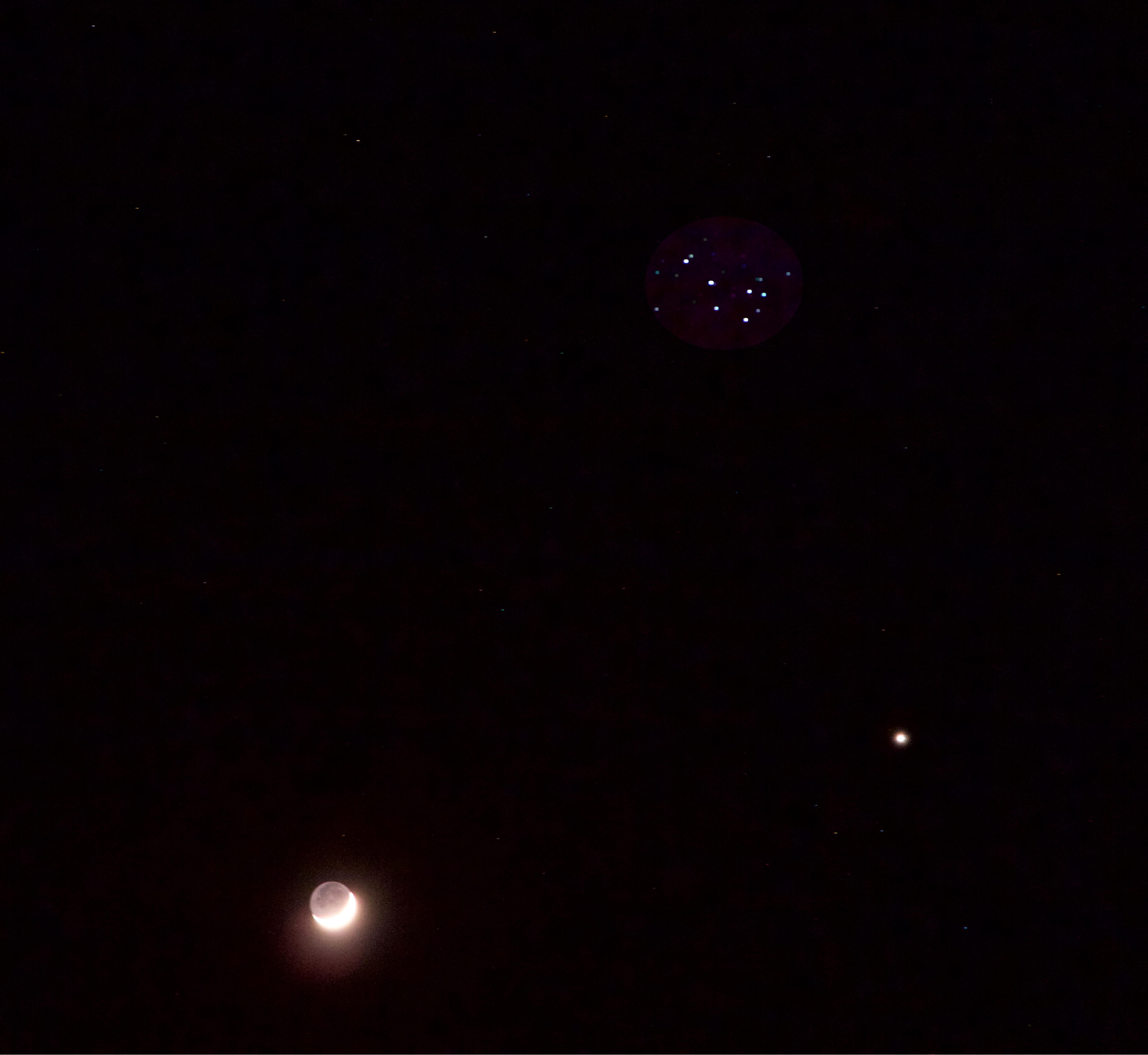 Mond und Venus bildeten am Abend des 28. März 2020 mit dem Sternhaufen der Plejaden ein fotogenes Dreieck, schön zu sehen am westlichen Abendhimmel. Bei Brennweite 70 mm, F4, ISO 800 mit APS-C-Kamera auf feststehendem Stativ in einem Bild aufgenommen.