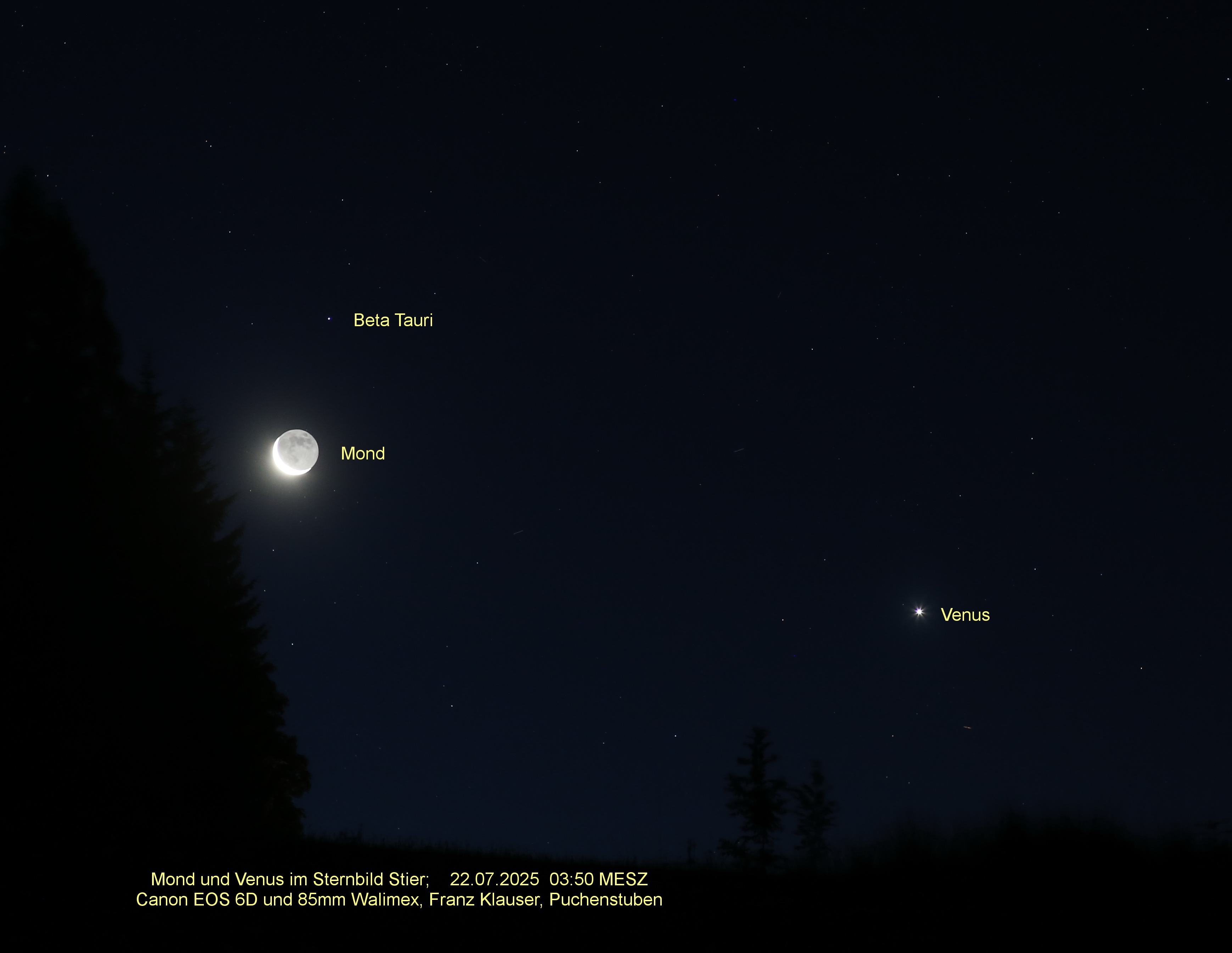 Nach einer Nacht mit beeindruckendem Sternenhimmel zeigte sich in der Morgendämmerung die schmale Mondsichel zusammen mit der Venus über meinem Osthorizont. Bei kurzen Belichtungen von 0,5 s zeigt sich auch das aschgraue Mondlicht.