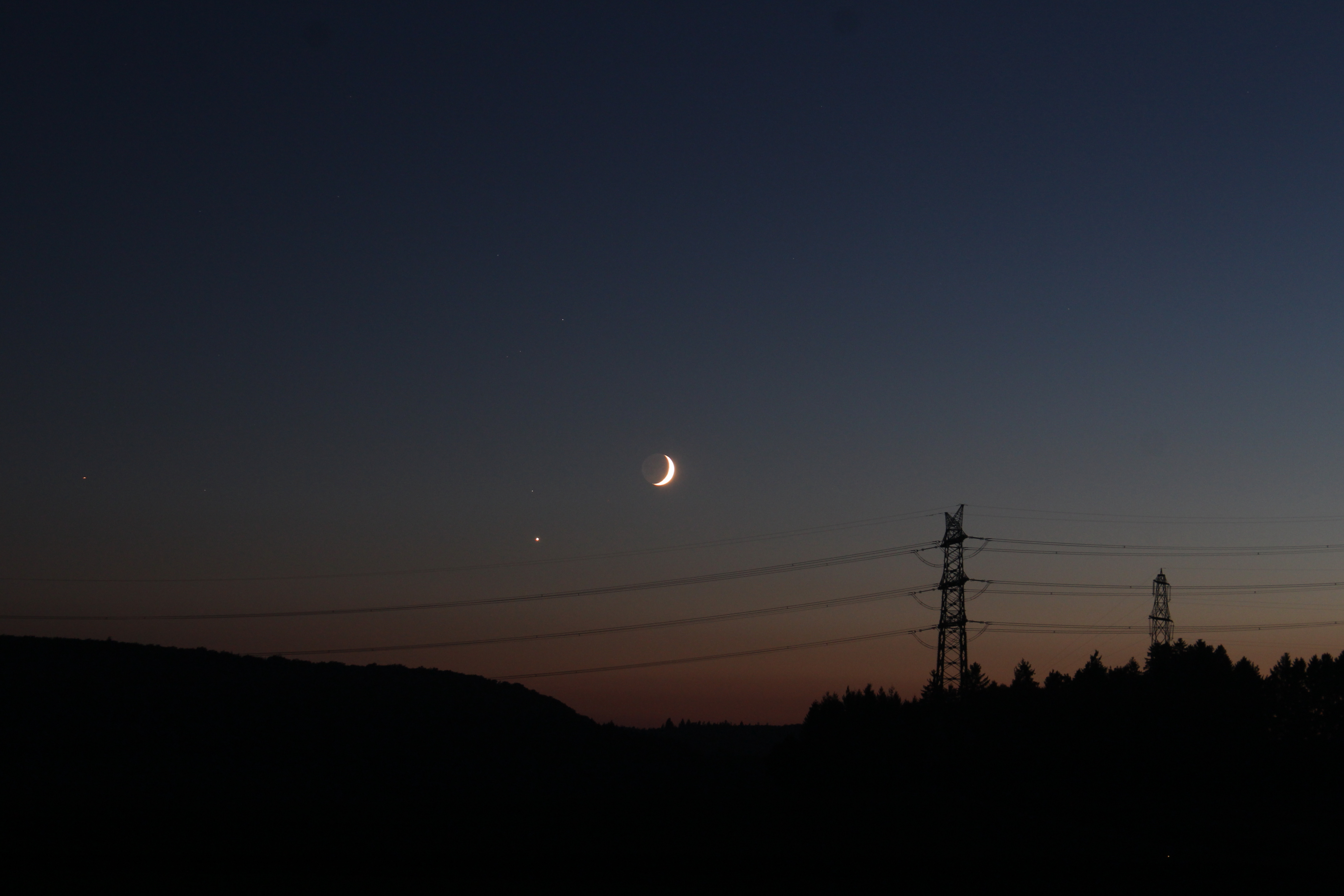 Mond und Venus mit Sternen des untergehenden Sternbildes Skorpion mit der Hochspannungsleitung Hoheneck-Herbertingen im Vordergrund. Das Bild entstand westlich von Eningen unter Achalm in der Nähe des Oberen Lindenhofs.