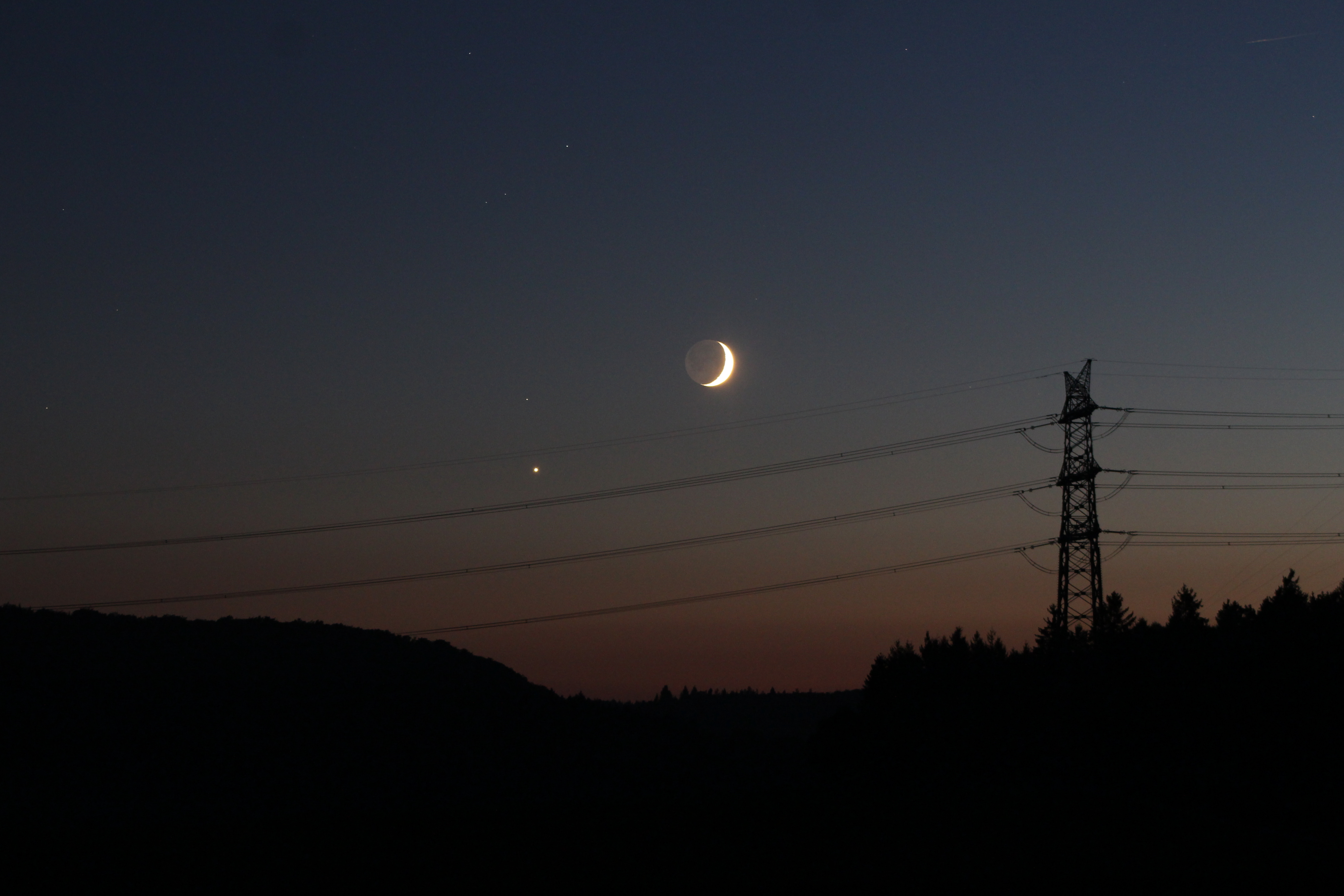 Mond und Venus mit Sternen des untergehenden Sternbildes Skorpion mit der Hochspannungsleitung Hoheneck-Herbertingen im Vordergrund. Das Bild entstand westlich von Eningen unter Achalm in der Nähe des Oberen Lindenhofs.