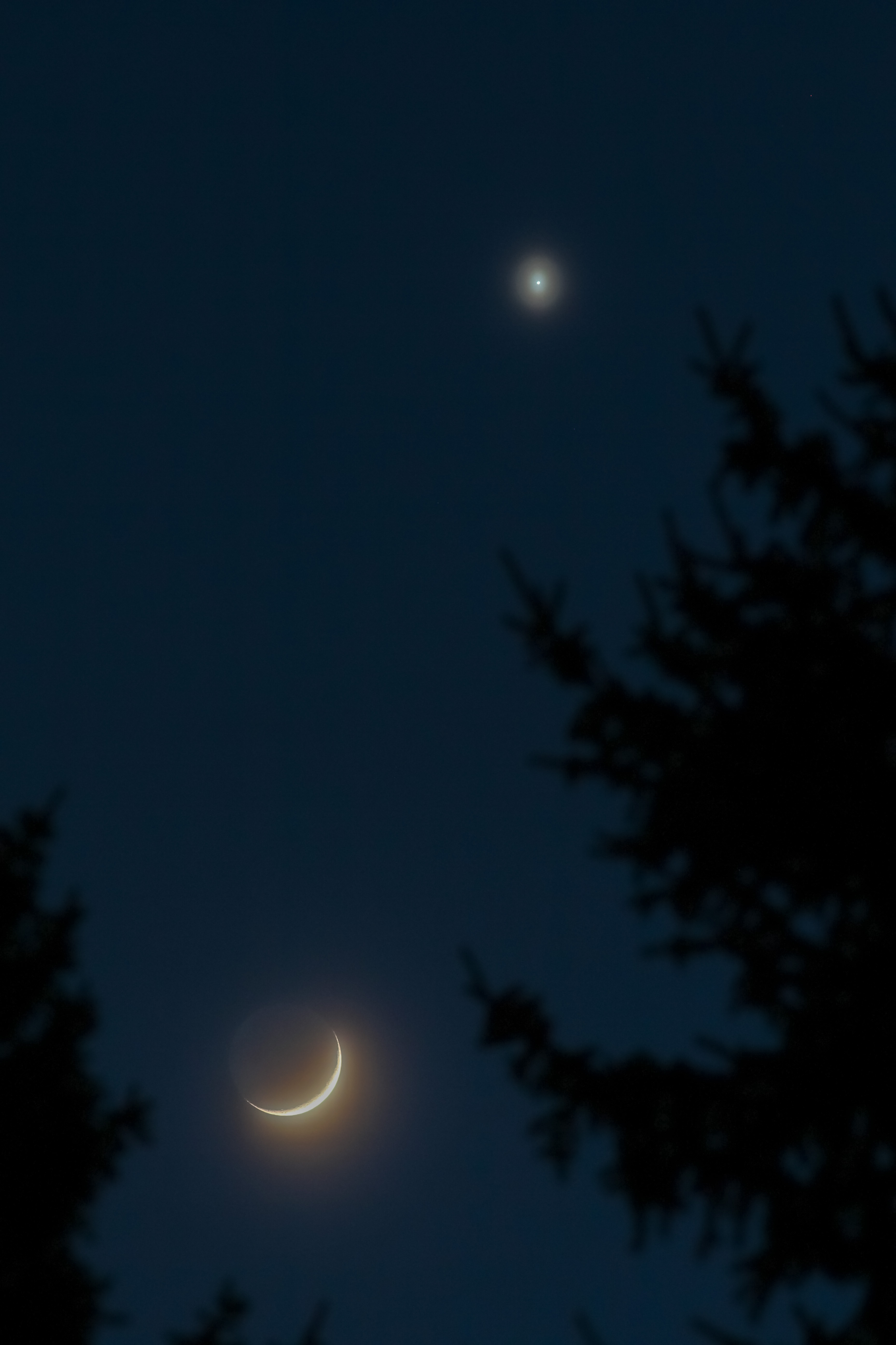 Mond und Venus am Abendhimmel. Auffällig ist die etwas in die Länge gezogene Aureole um die Venus.