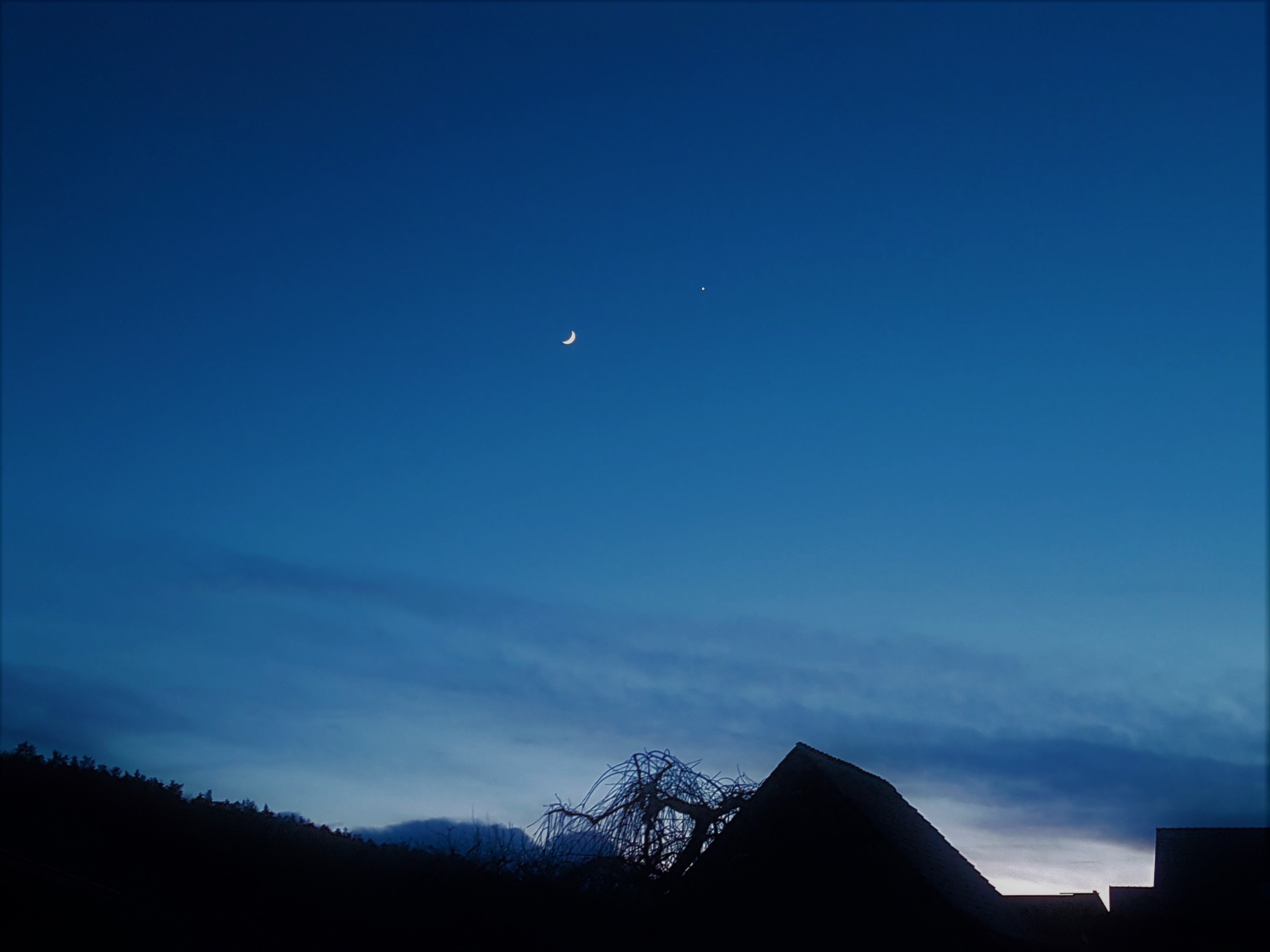 Am Abend des 28. Januar 2020 erstrahlte kurz nach dem Sonnenuntergang das Pärchen Mond und Venus am Westhimmel. Der super Kontrast zwischen Vorder- und Hintergrund und dem abnehmenden Sonnenlicht sah echt klasse aus. Leider hatte ich nur das Handy parat.