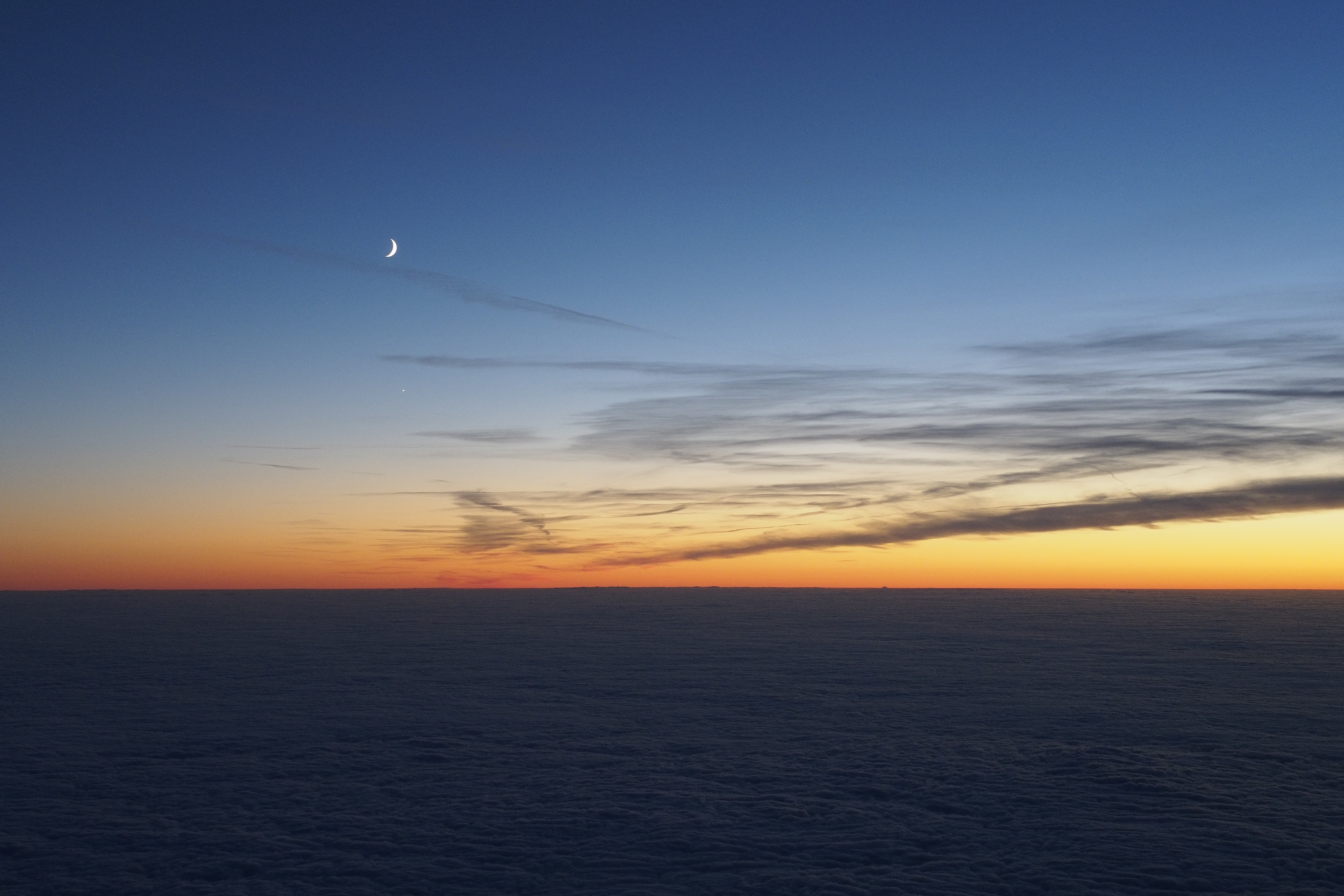 Deutschland lag unter einer Hochnebeldecke, nur in einzelnen Höhenlagen oder aus dem Flugzeug (hier ein A320) gelang der Blick auf die Konjunktion von Mond und Venus.