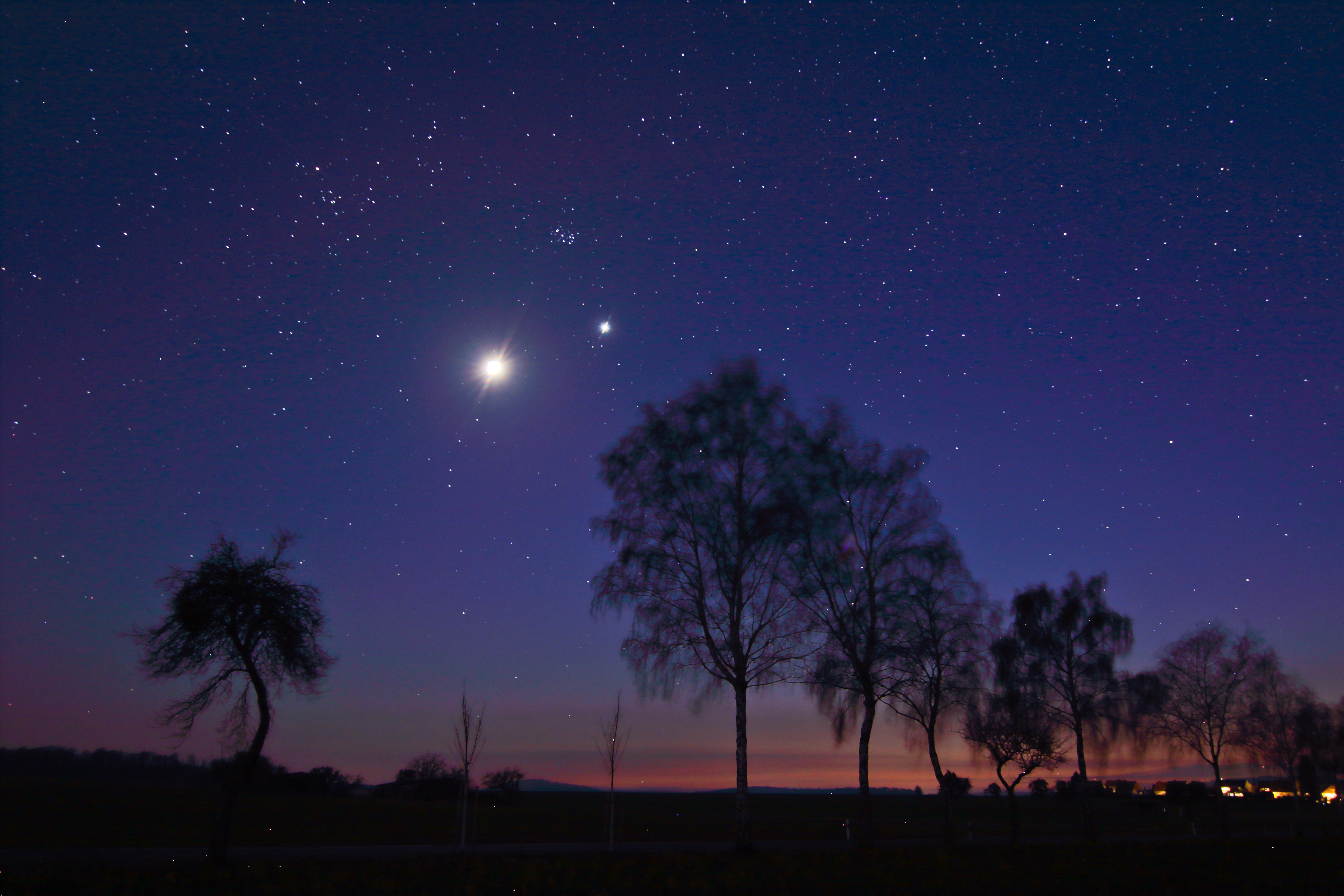 In der fortgeschrittenen Dämmerung des 28. März 2020 konnte die Begegnung von Mond und Venus im interessanten Sternfeld des Tors der Ekliptik mit den Hyaden und Plejaden beobachtet werden.