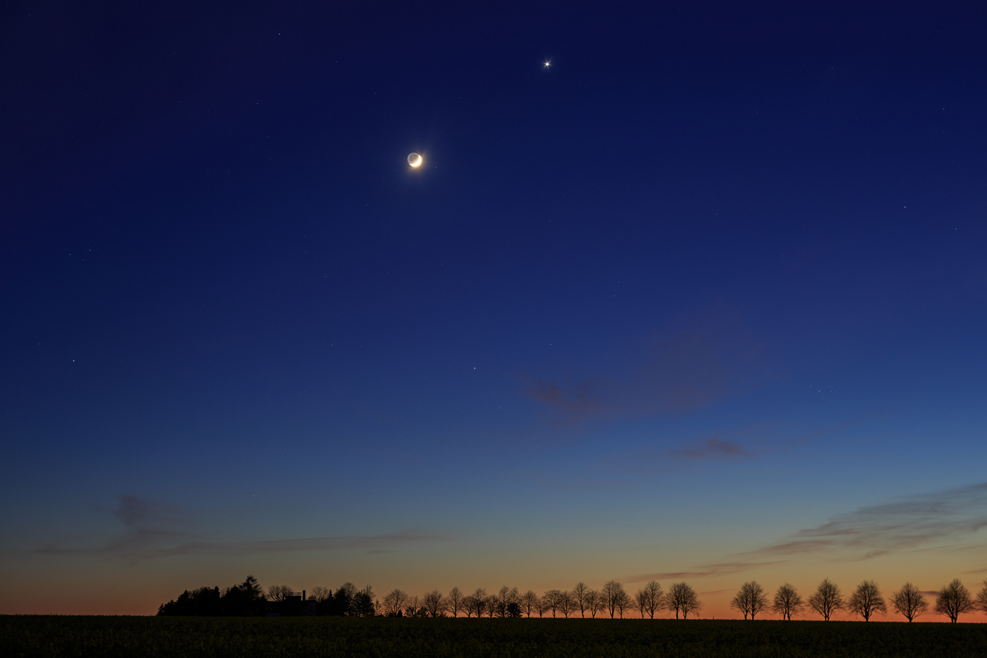 Noch einmal eine schöne Sicht zu Mond und Venus am Abend des 26. April 2020 auf dem Lerchenberg bei Börnchen in Sachsen. Der Abstand betrug zum Aufnahmezeitpunkt 6,5 Grad. Es könnte fast schon die letzte Begegnung zwischen Mond und Venus als Abendstern sein … Hoffen wir noch auf die Begegnung mit Merkur und Mond am Abend des 24. Mai 2020 …