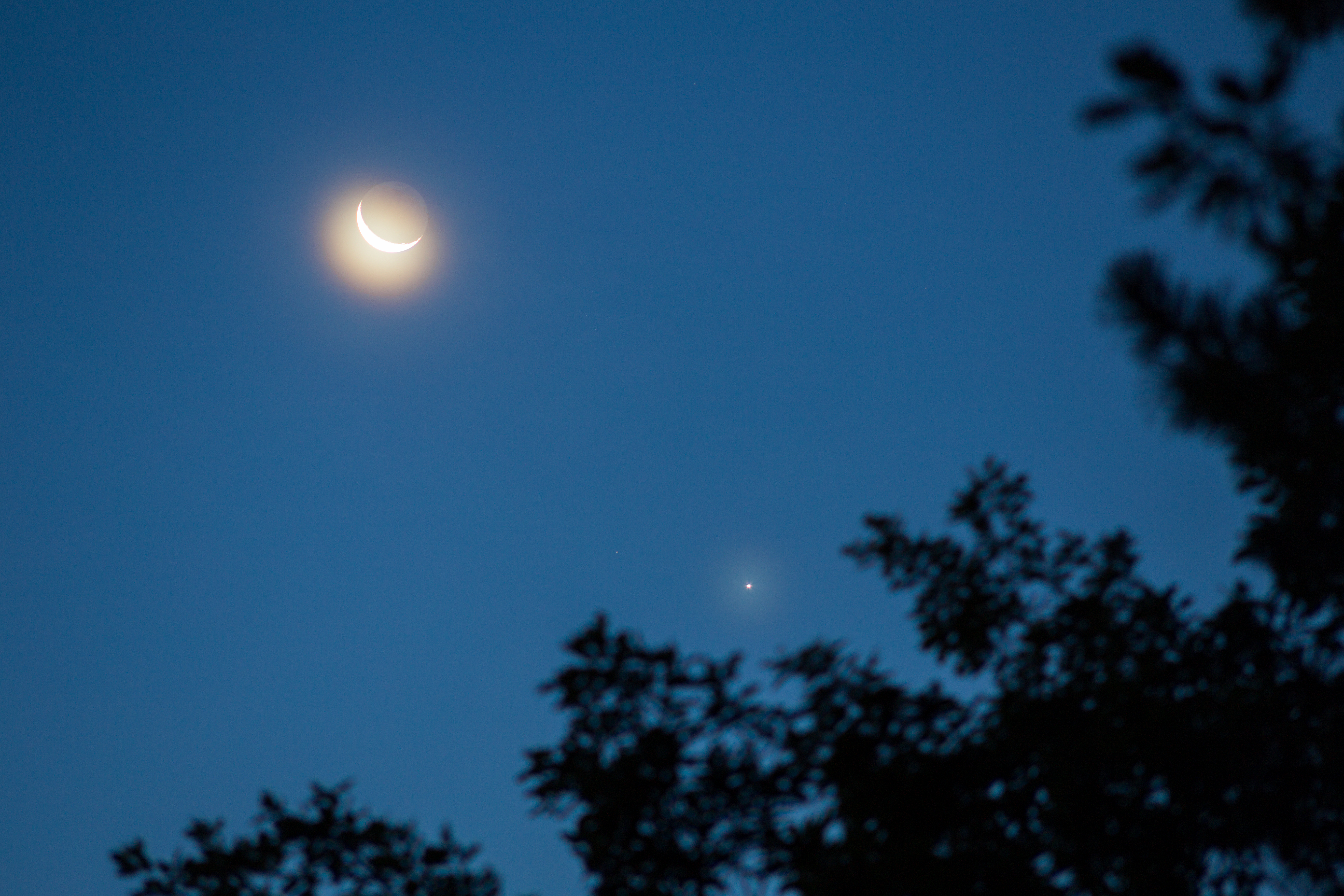 Enge Begegnung von Mond und Venus heute morgen am 14. September 2020. Der Abstand zum Aufnahmezeitpunkt betrug 4,2°. Leider ist es schwierig, bei solch hohen Konstellationen über dem Horizont einen schönen Vordergrund mit ins Bild zu bekommen … Um Mond und Venus bildeten sich durch dünne Zirrusbewölkung Aureolen.