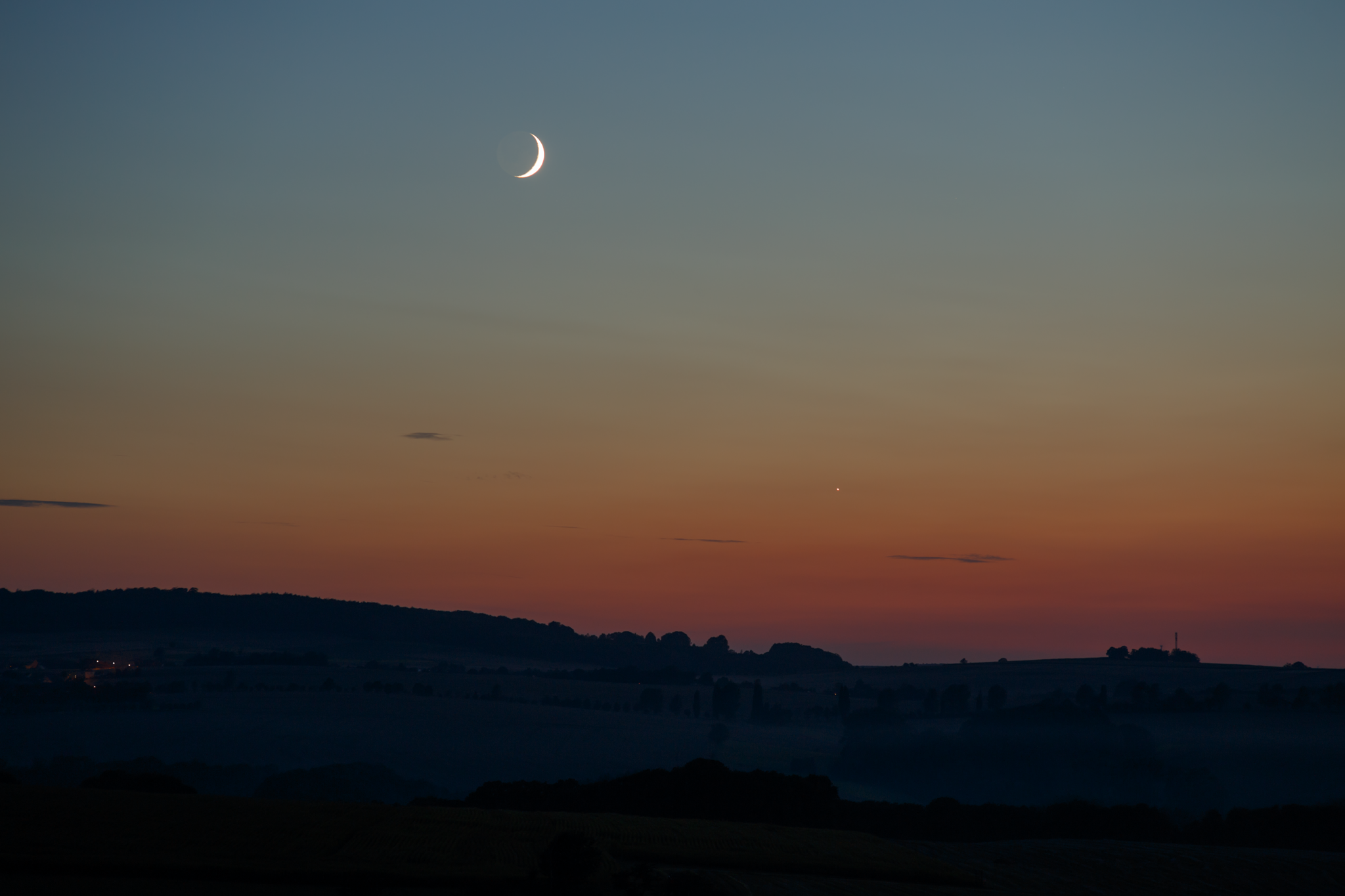 Hübscher Anblick von Mond und Venus am Abend des 11. August 2021 mit 5,3 Grad Distanz. Am Abend zuvor, zu einer noch wesentlich dünneren Sichel, war es leider bedeckt.