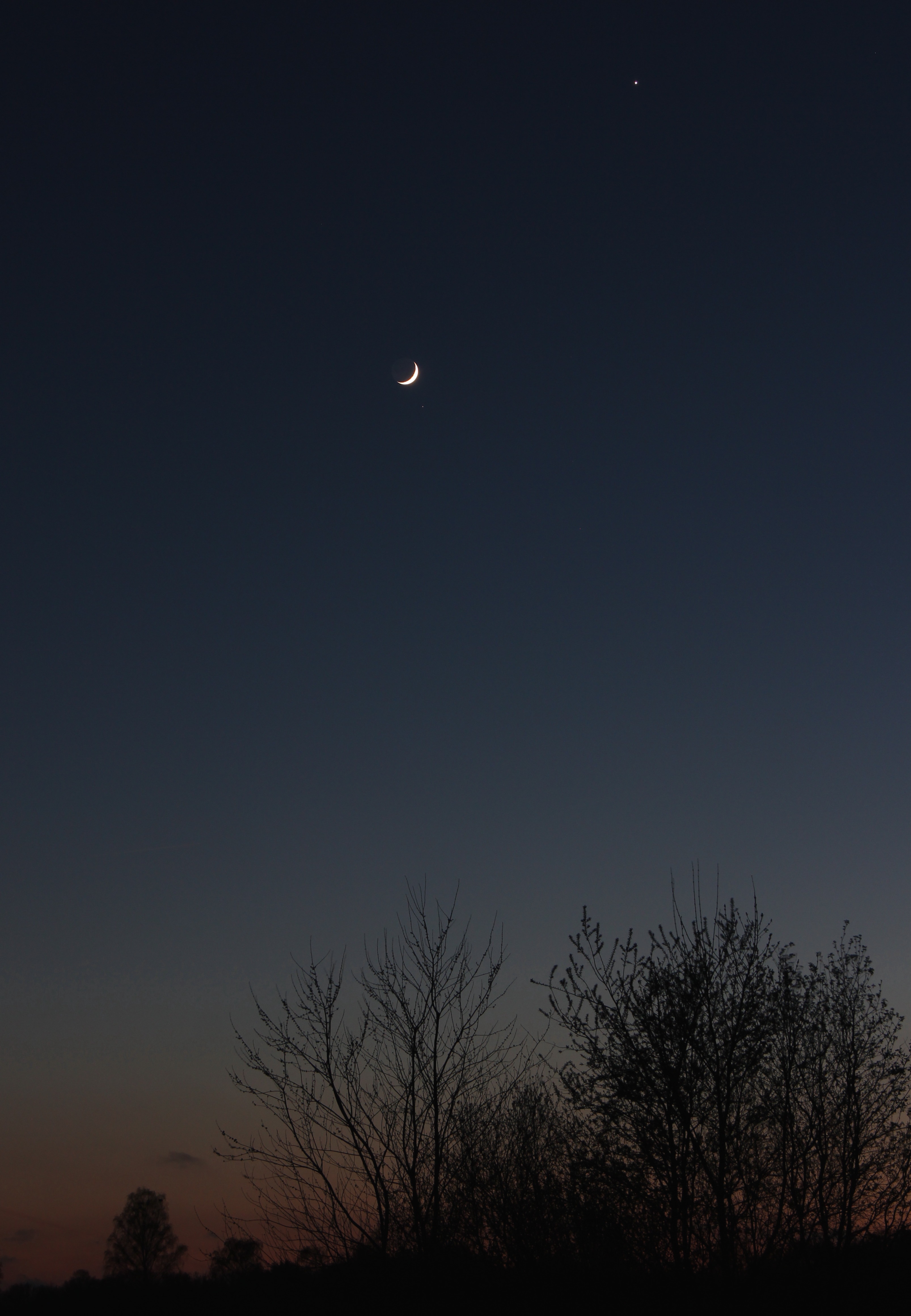Am 21. April 2015 standen die junge Mondsichel, Venus und Aldebaran in enger Konjunktion. Alpha Tauri ist im Bild rechts unterhalb des Mondes zu sehen. Diese "Dreier-Konjunktion" konnte am Abendhimmel über Uelzen nach einem schönen Sonnenuntergang sehr gut beobachtet werden.