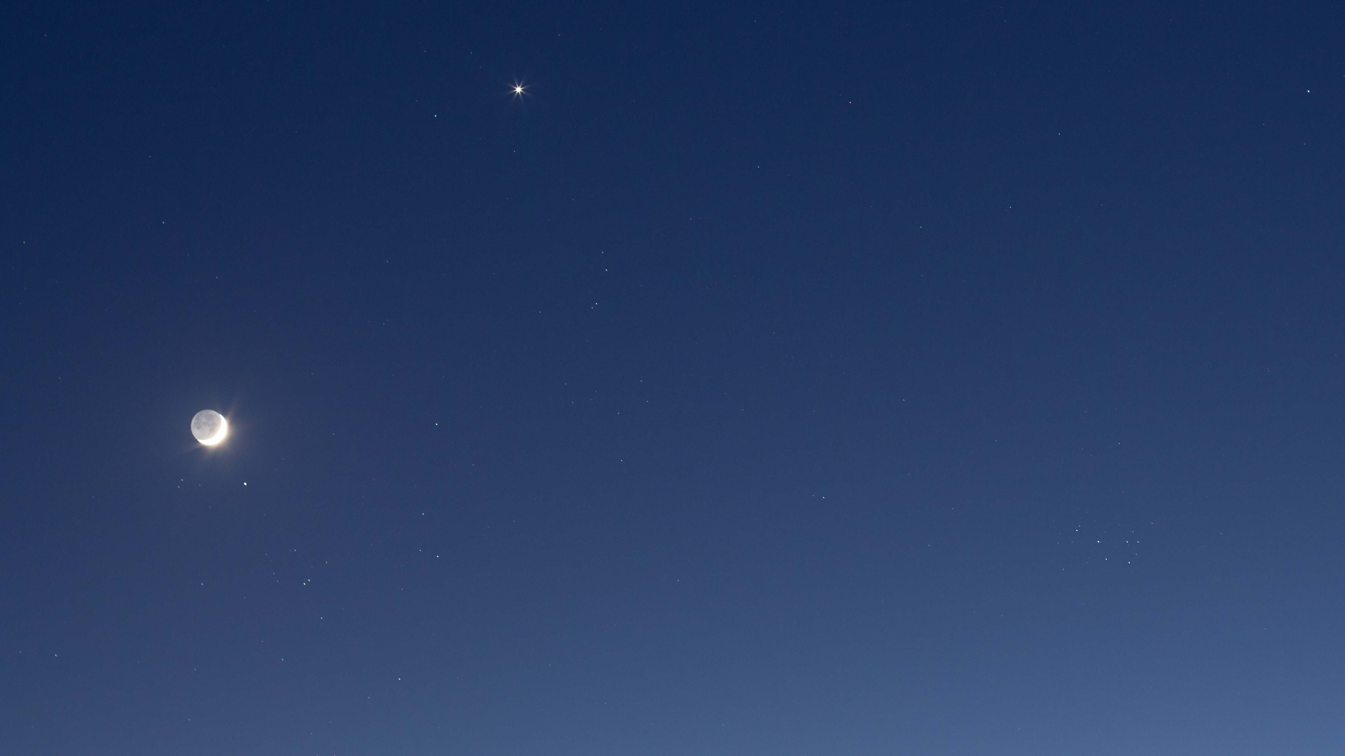 Am Abend des 21. April 2015 befand sich der Mond nahe Aldebaran im Sternhaufen der Hyaden, Venus und Plejaden nicht weit entfernt. Das Abblenden des Objektivs erzeugt die sternförmigen Erscheinungen um Mond und Venus.