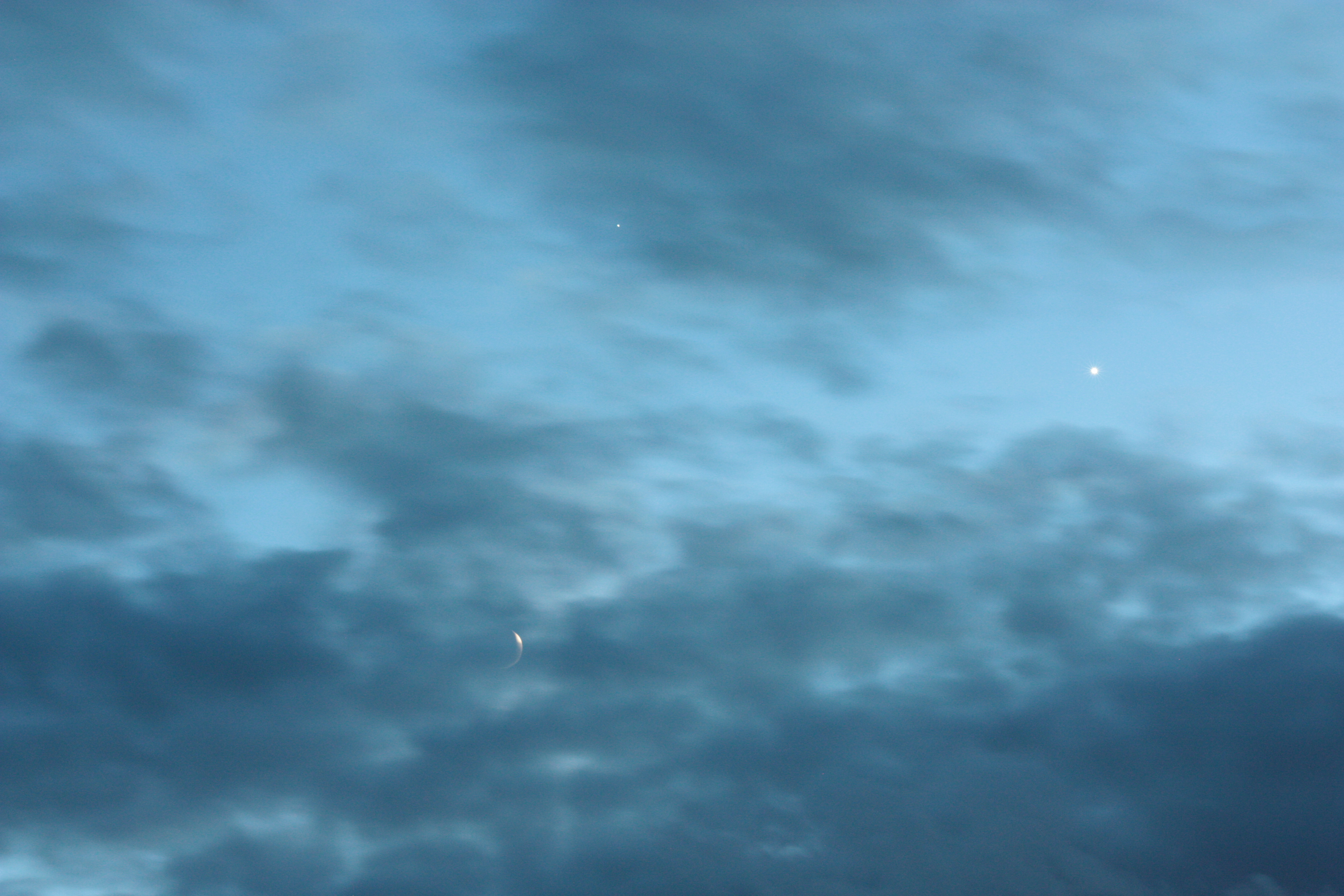 Trotz Wolken in Kärnten gelang mir dieses Foto in der Dämmerung. Ich hatte Glück, den Mond mit den beiden Planeten zu erwischen.