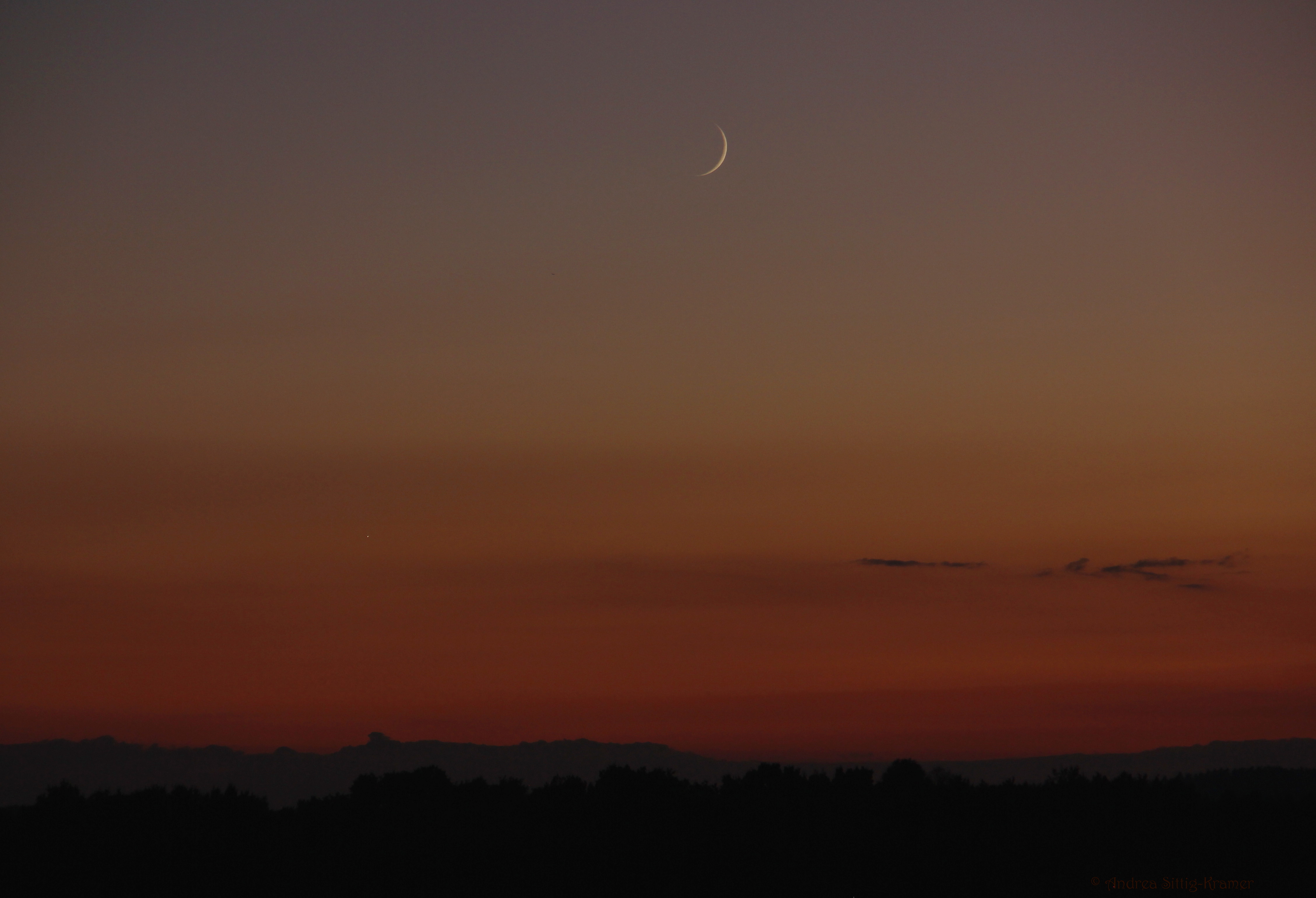 Am 3. Oktober 2016 leuchtete der Himmel nach Sonnenuntergang in unzähligen, wunderschönen Gold- und Rottönen. Zusätzlich standen an diesem Abend der drei Tage junge Mond und die -3,9 mag helle Venus in Konjunktion zueinander: Sie standen von der Erde aus betrachtet scheinbar sehr eng zusammen. Das schmale Band dunkler Wolken am Horizont, welche die Himmelsbeobachtungen sonst eher stören, verliehen der Konstellation von Abendstern und schmaler Mondsichel eine geradezu künstlerische Untermalung. Ein überwältigender Anblick - nicht nur für Hobbyastronomen!