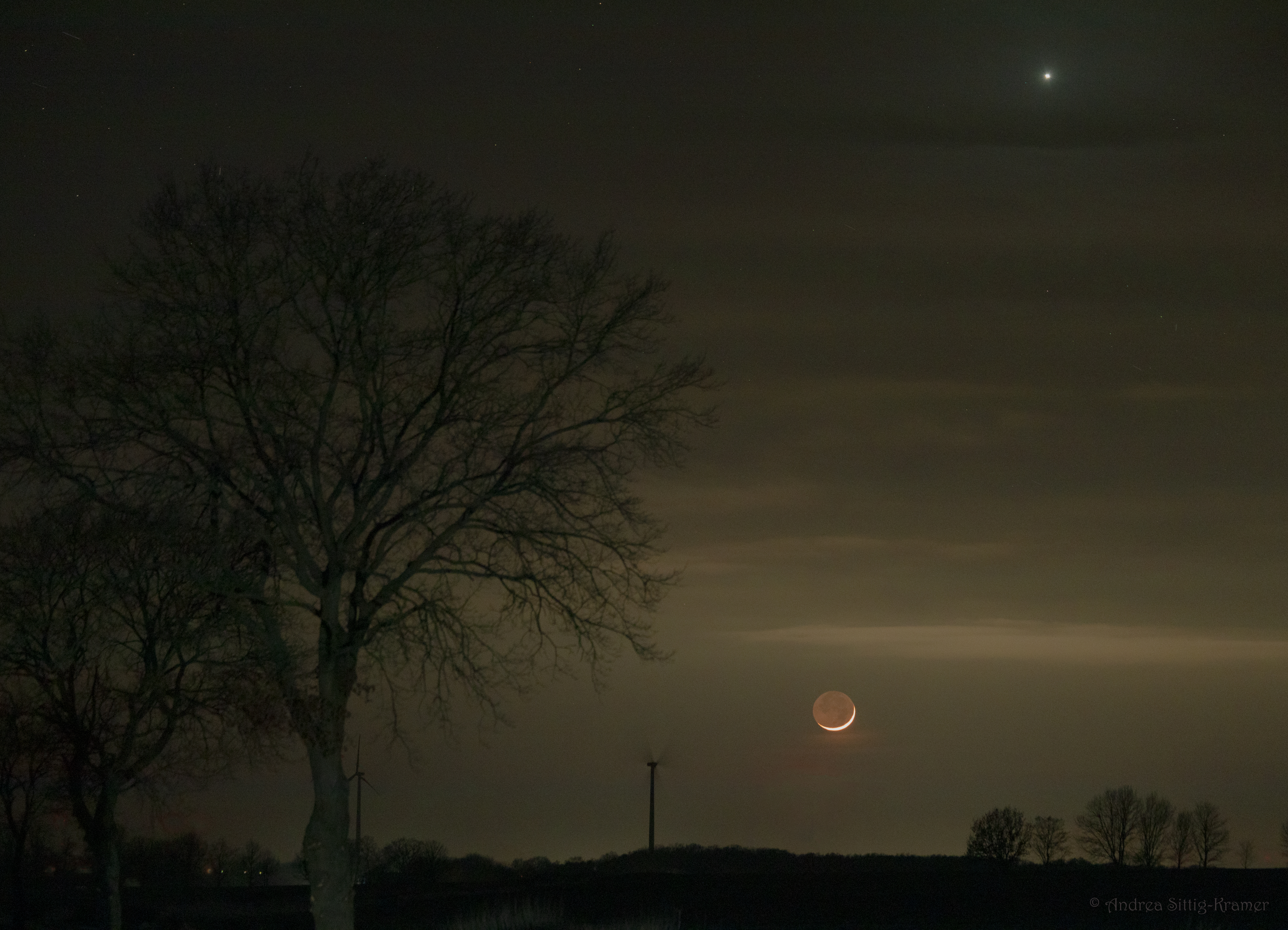 Am Abend des 1. März 2025 standen Venus und der einen Tag alte Mond in Konjunktion zueinander. Die zunehmende Mondsichel schien aus unserer Erdperspektive ungefähr 9 Grad SSW von unserem inneren Nachbarplaneten zu stehen. Unser Trabant war zu rund vier Prozent beleuchtet und der unbeleuchtete Teil schimmerte schwach als aschgraues Mondlicht. Die Aufnahme entstand 50 Minuten vor Untergang des Mondes, bzw. unmittelbar bevor er in den Wolken am Horizont verschwand. Ein himmlischer Lichtblick in einer Zeit von fast dauerhafter Bewölkung.