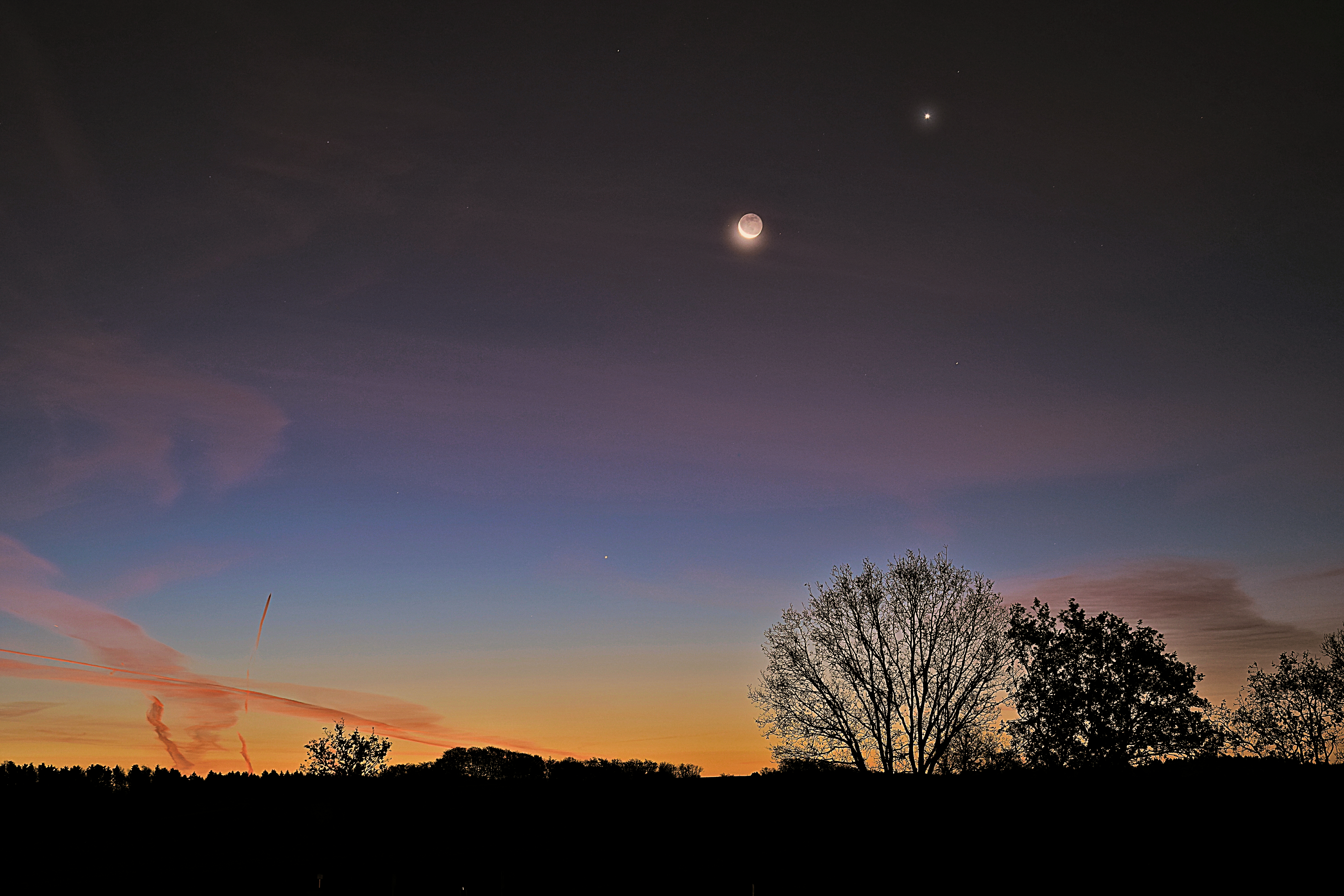 In der leicht frostigen Morgendämmerung konnte über dem Märkischen Sauerland ein schönes Himmelsschauspiel beobachtet werden. Die hohen Eiswolken zauberten im aufgehenden Sonnenlicht ein buntes Farbspektakel an den Himmel. Dazwischen konnten sich neben der schmalen Mondsichel noch die hellen Lichtpunkte von Venus und Spika behaupten. Etwas knifflig wurde es mit der Sichtbarkeit des flinken Merkur, der hier auf der Horizontlinie zwischen dem aufsteigenden Flugzeug und der Baumkrone auszumachen ist.