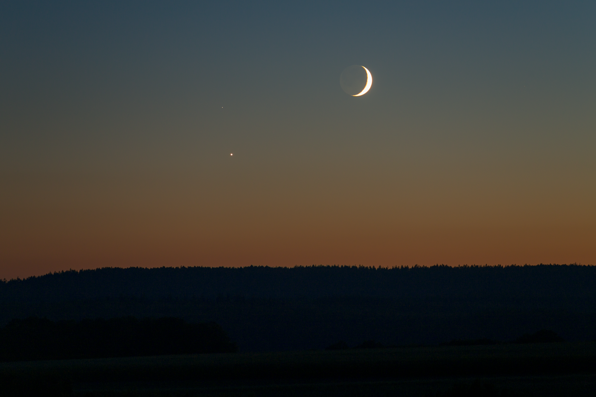 Dreierbegegnung der Mondsichel, Venus und dem Stern Delta Scorpii (Dschubba, +2,29 mag) am Abend des 9. Oktober 2021 um 19:17 Uhr MESZ. Venus befand sich 2,5° südlich des Mondes. Der Himmel war sehr klar dank goldenem Oktoberwetter. Eine der engsten Begegnungen des Mondes mit dem Abendstern in der momentanen Abendsichtbarkeit bisher.