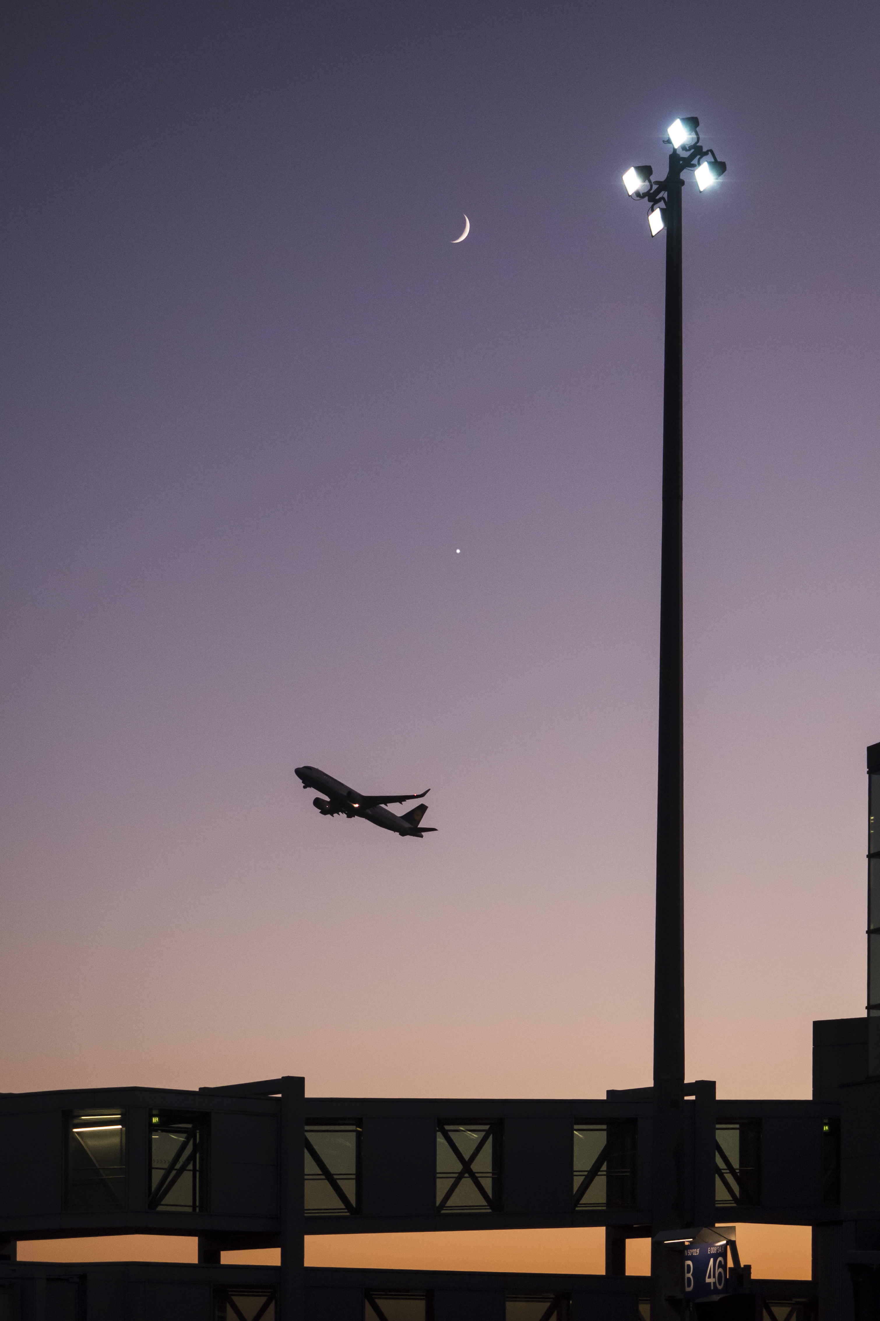 Anfang Dezember begegnete der Mond erst Venus, dann Mars. Die Konjunktion mit ersterer zeigt dieses Foto, das beim Warten am Frankfurter Flughafen entstand. Im Vordergrund startet ein Lufthansa Airbus A320.