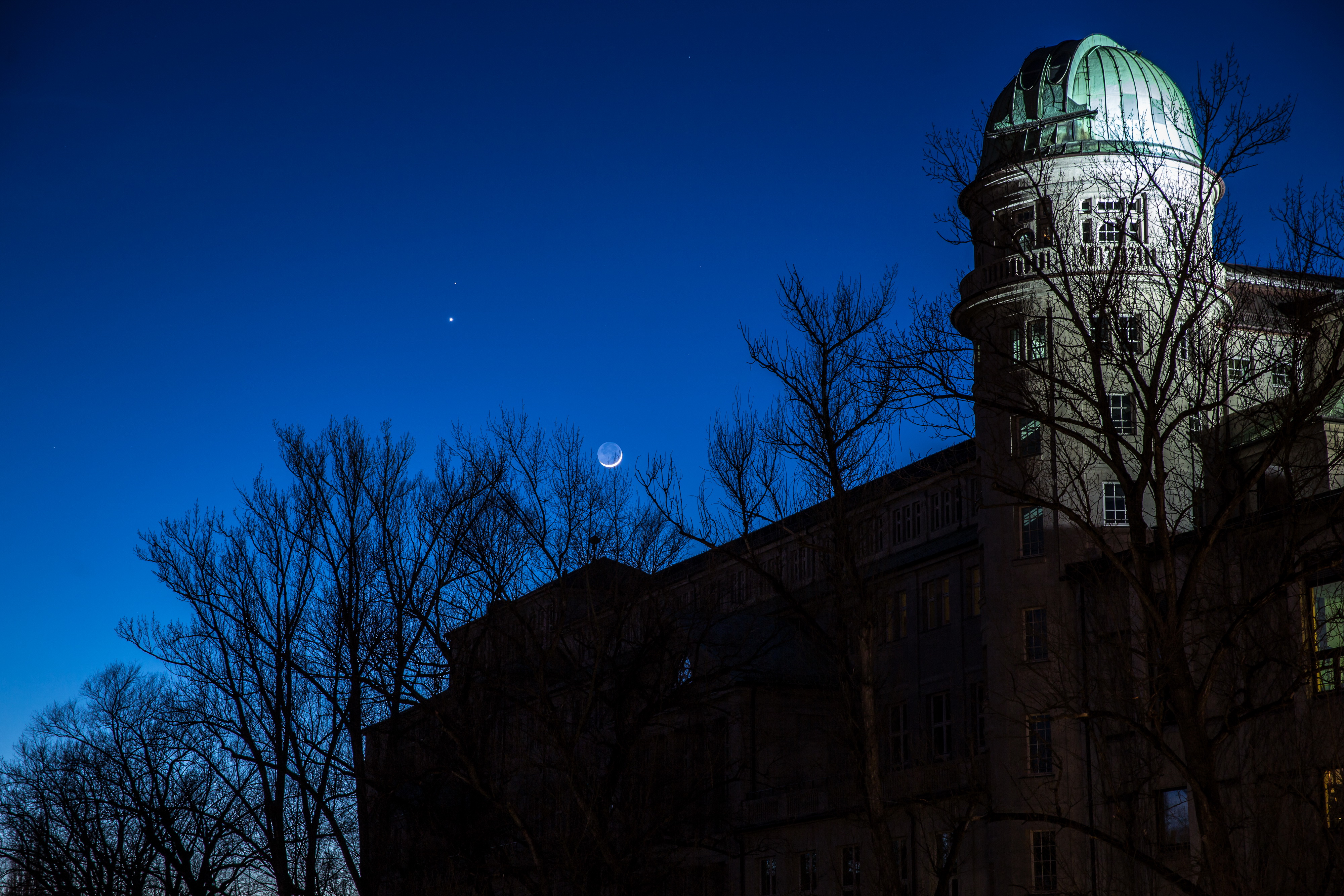Begegnung der Planeten Mars und Venus und unserem Erdtrabanten zwei Tage nach Neumond. Die Aufnahme zeigt das "Dreigestirn" neben der Oststernwarte des Deutschen Museums in München.