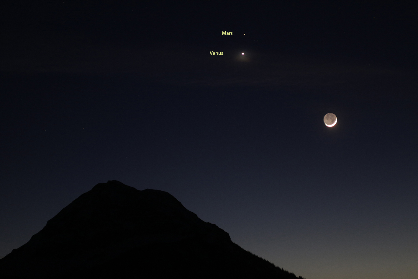 An diesem Abend gruppierten sich Mond, Venus und Mars nahe dem 1893 Meter hohen Ötscher, dem höchsten Berg im südwestlichen Niederösterreich