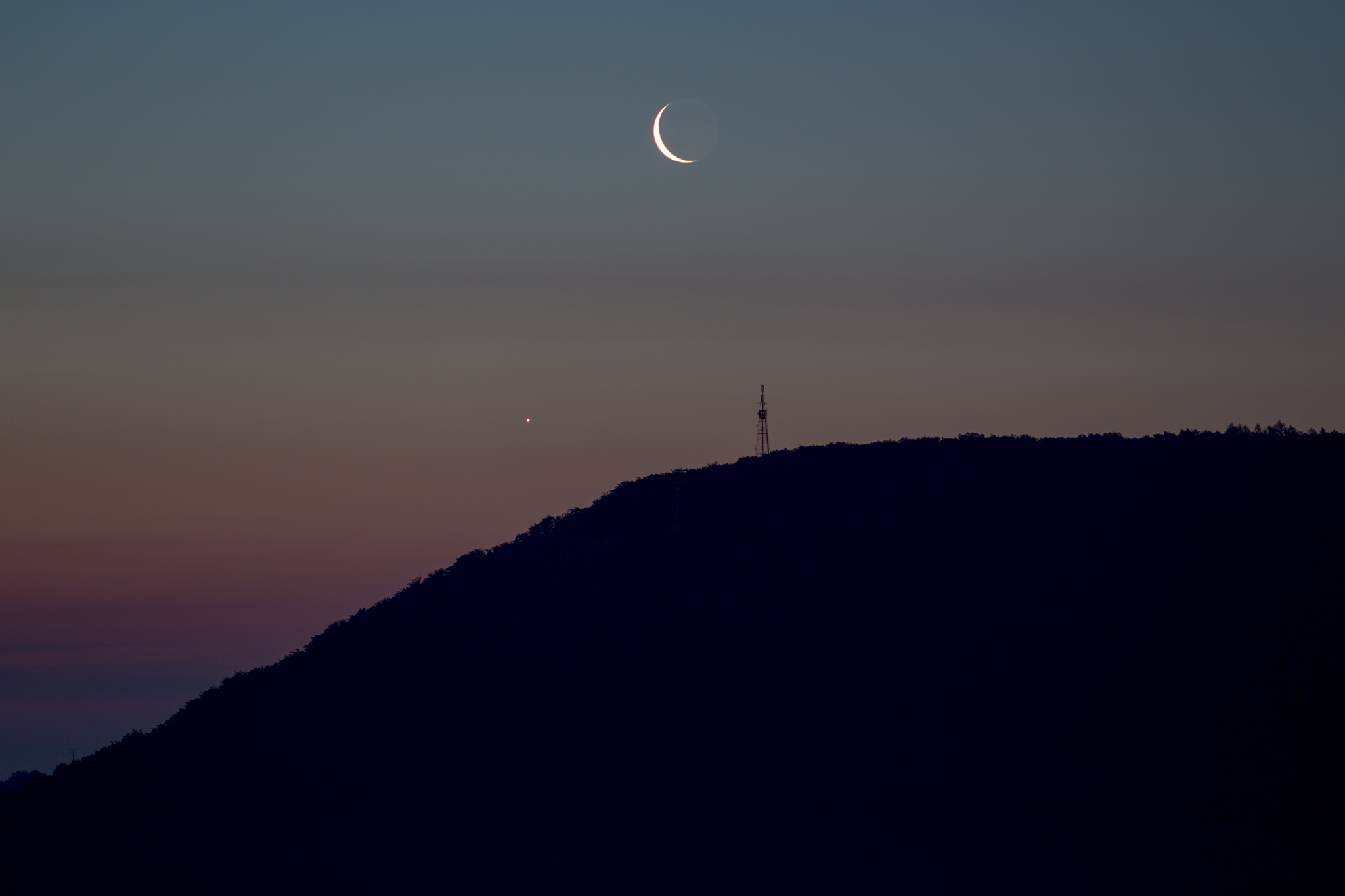Eindrucksvolle, enge Begegnung der schmalen Mondsichel mit Venus am Morgen des 26. Juni 2022 – exakt über dem Gipfel des Windbergs, des Hausbergs der Stadt Freital. Die Entfernung betrug 2,6 Grad. Für die Plejaden oben drüber reichte die Transparenz des Himmels leider nicht aus.