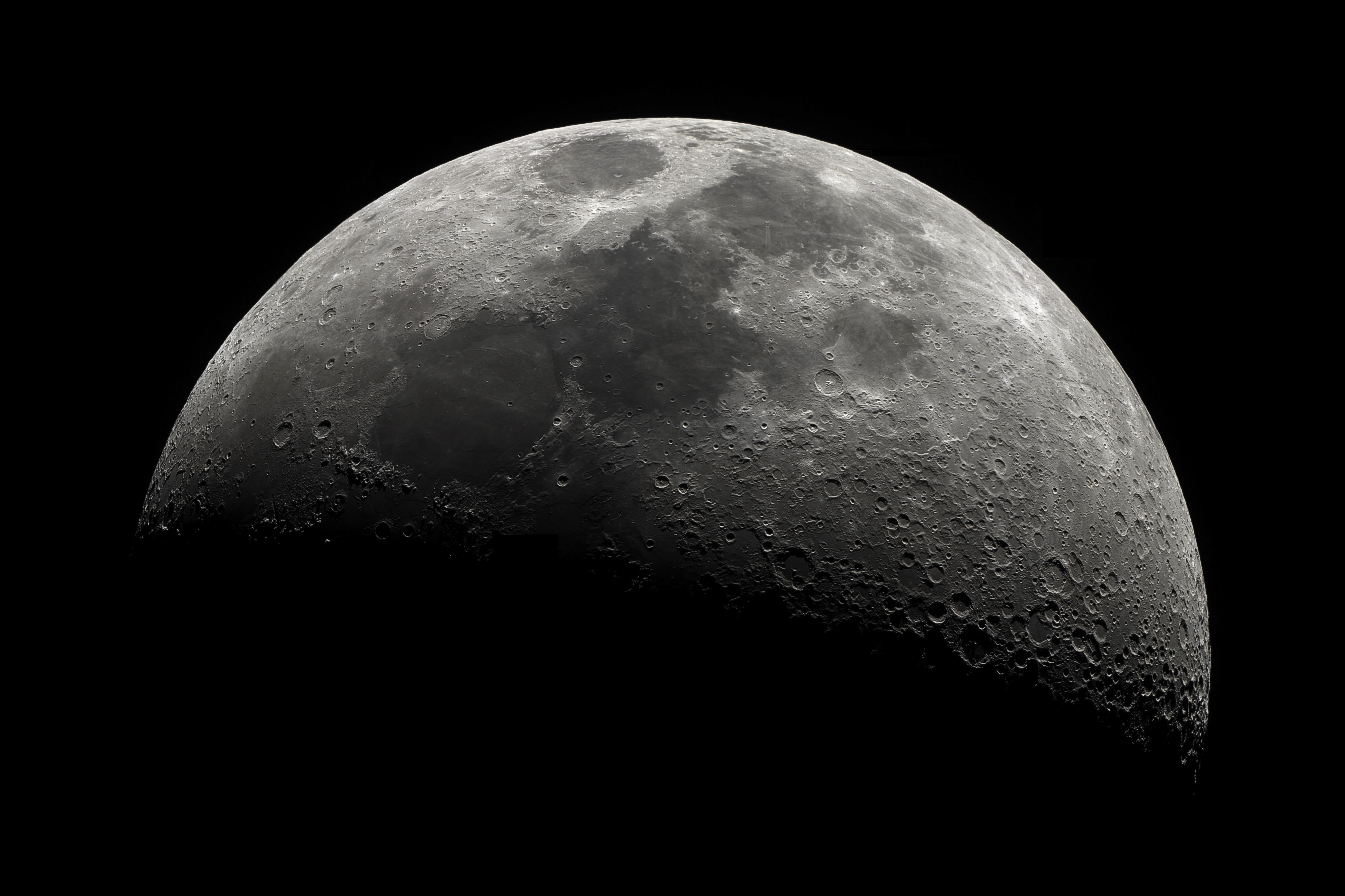 Diese Mosaikaufnahme gelang vom heimischen Balkon - durch das Katzennetz hindurch geschossen! - mit Hilfe eines Dobson und etlichen »Schubsern«, um den Mond streifenweise von oben nach unten durch das Blickfeld laufen zu lassen und filmen zu können. Das Bild zeigt, dass Astrofotografie auch in der Großstadt und selbst bei großen Brennweiten ohne parallaktische Montierung möglich ist.