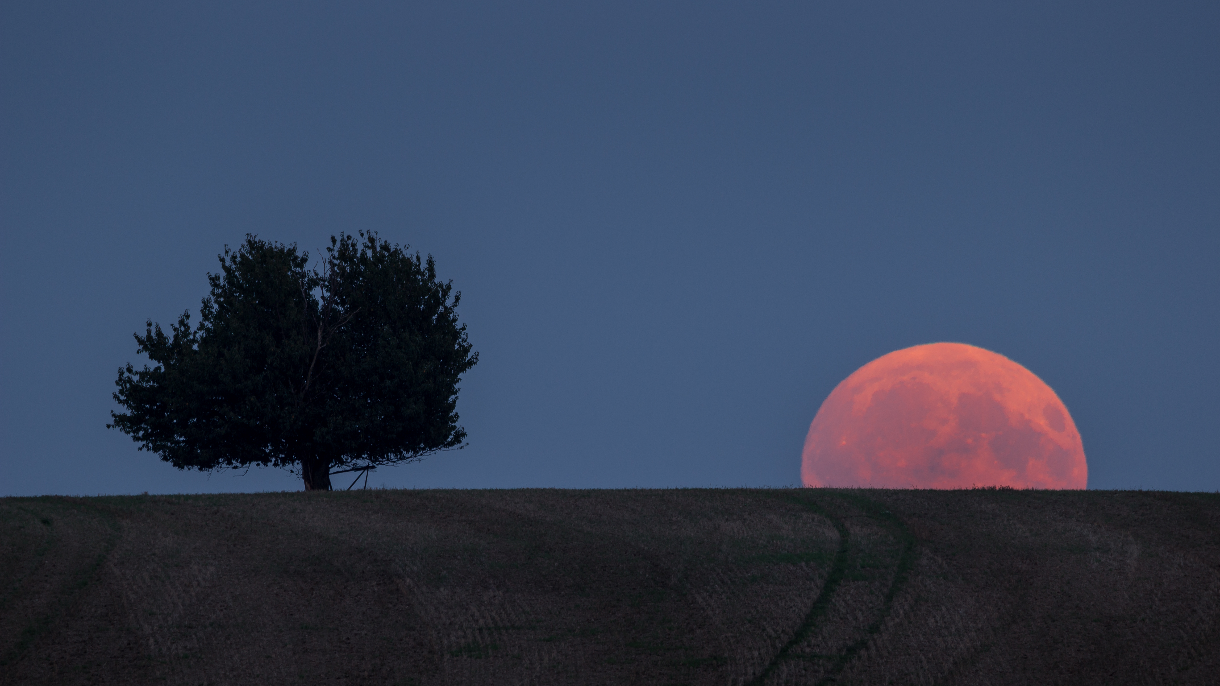 Einen schönen Mondaufgang konnte ich heute Abend beobachten. Genau neben einem Kirschbaum, der ganz einsam auf einer Kuppe steht. Leider verschwand der Mond nach einigen Minuten in den heranziehenden Wolken, die den nächsten Regen ankündigen.