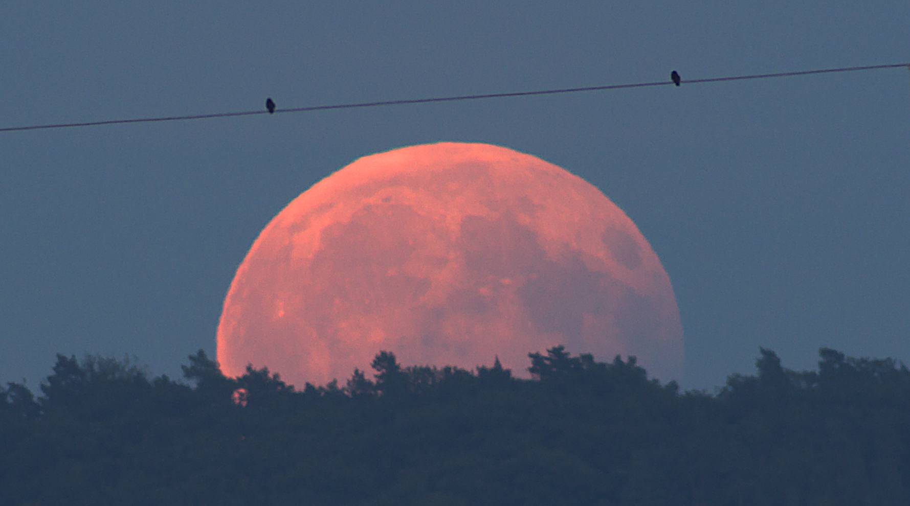 Es war schon ein beeindruckender Anblick, den Mond mit so roter Färbung aufgehen zu sehen. Es lag wohl an der etwas diesigen Durchsicht, etwas später mit zunehmender Höhe wurde er dann gelblicher in der Färbung. Die beiden Vögel auf der Stromleitung sind wohl auch astronomisch an der Mondfinsternis interessiert …