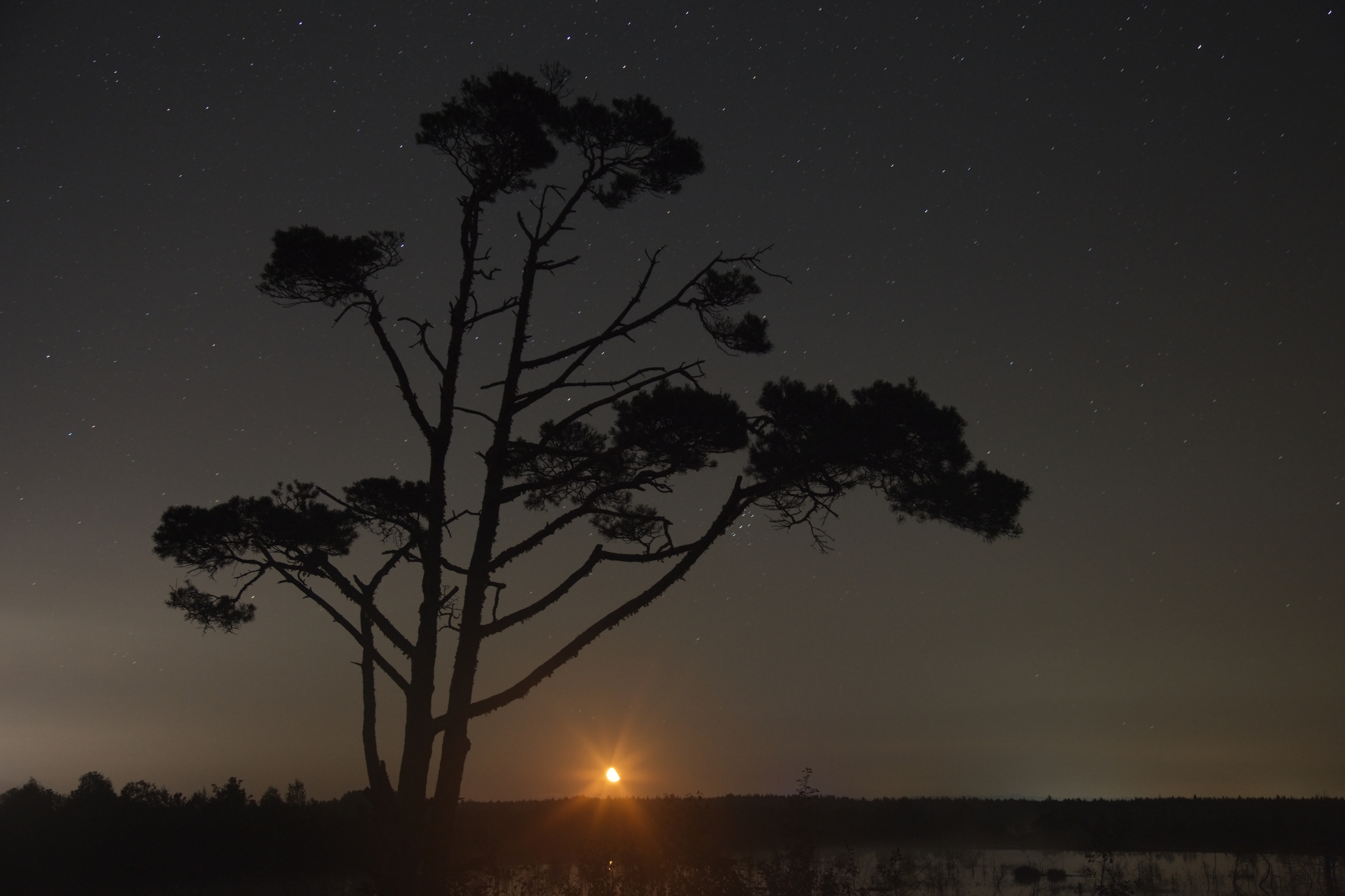In einem Moor, das sich in der Nähe meines Wohnorts befindet, wollte ich den Mondaufgang fotografieren. Um 23:06 Uhr ging er dann orangerot-gefärbt hinter einer Moorkiefer auf.
