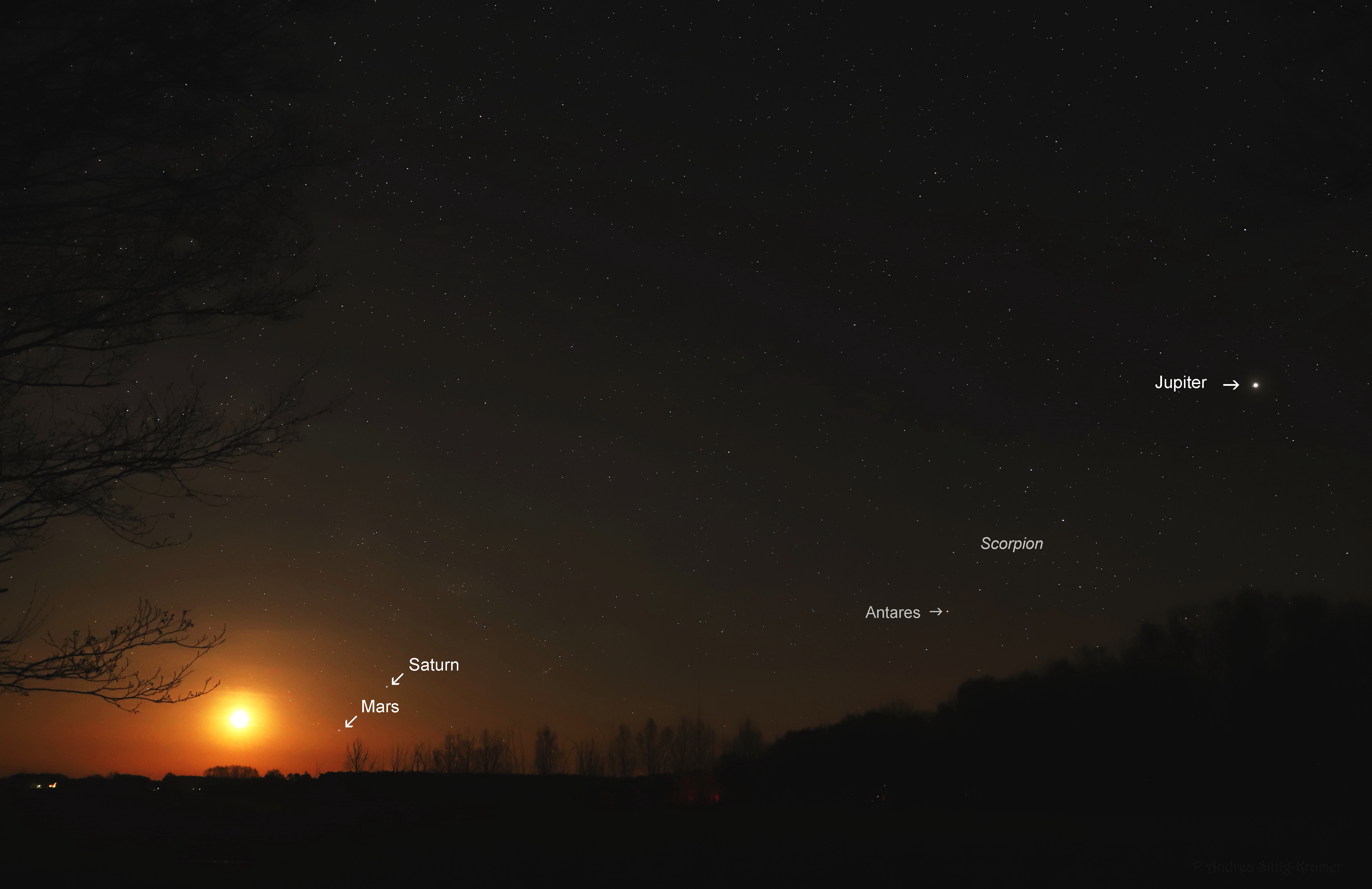 Am frühen Morgen des 8. April ging der abnehmende Halbmond um gegen 4 Uhr auf. Rechts neben dem hell orange leuchtenden Erdtrabanten konnte ich mit bloßen Augen Mars, Saturn und Jupiter auffinden. Beim Teleskoptreffen in Malliß bei Ludwigslust neigte sich damit die letzte Beobachtungsnacht dem Ende. Zwischen den beiden großen Gasplaneten war trotz Horizontnähe das Sternbild Skorpion mit seinem Alpha-Stern Antares deutlich zu sehen. Traumhafte Beobachtungsbedingungen für das wunderschöne Himmelsschauspiel!