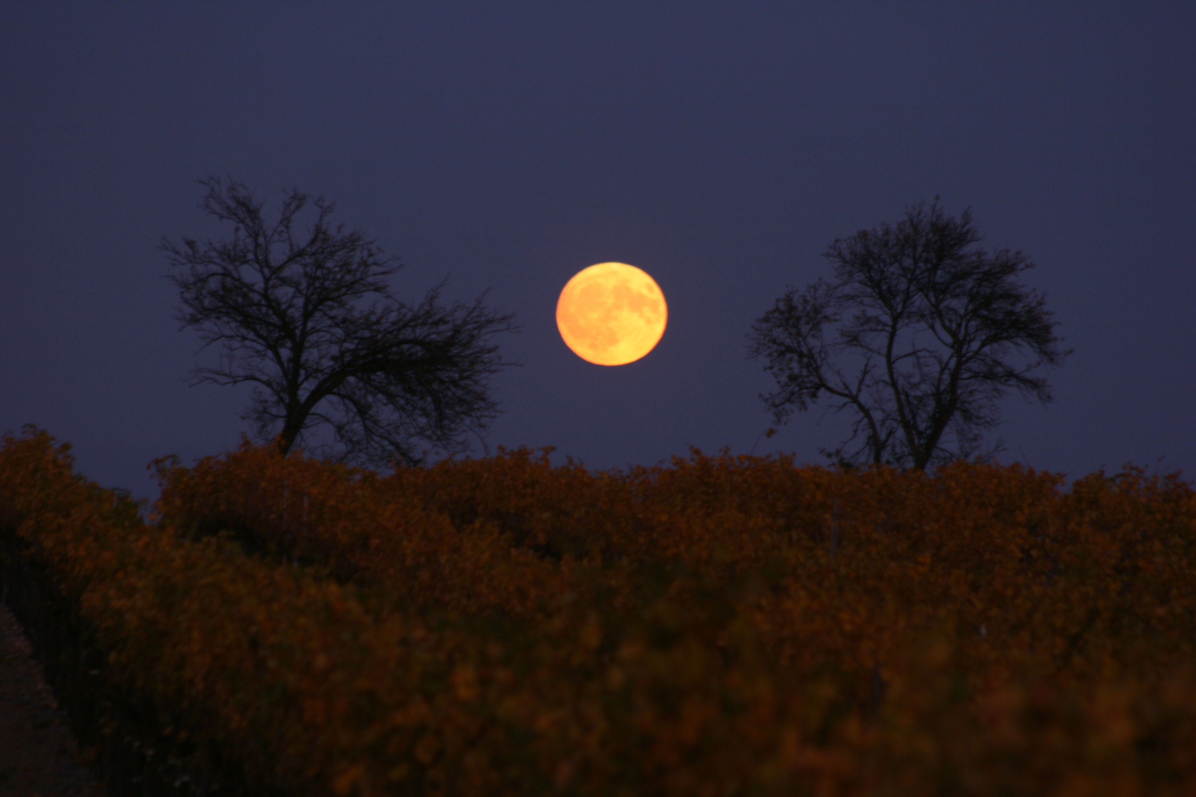 Am 3. November 2017 ergab es sich, dass die Sonne in Krems an der Donau, Niederösterreich um 16:35 Uhr unterging und der Mond um 16:40 Uhr aufging. Mit dem noch hellen Dämmerungshimmel ergab sich mit gelb gefärbtem Weingarten diese Stimmungsaufnahme.