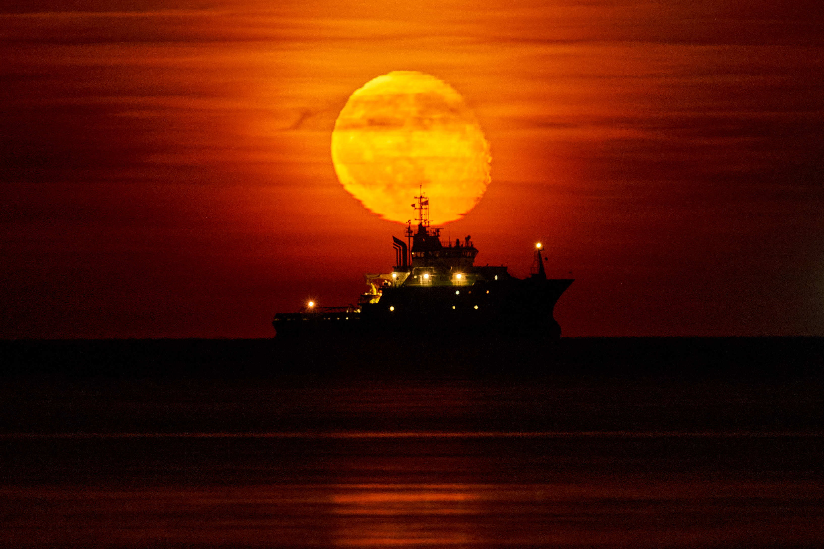 An einem kalten Abend an der Ostsee (Wittenbeck) habe ich dieses Bild vom dortigen Strand aus aufgenommen. Zu sehen ist das Schiff Baltic, das vor der Küste ankert. Über dem Schiff ist der kurz zuvor aufgegangene Mond zu sehen.