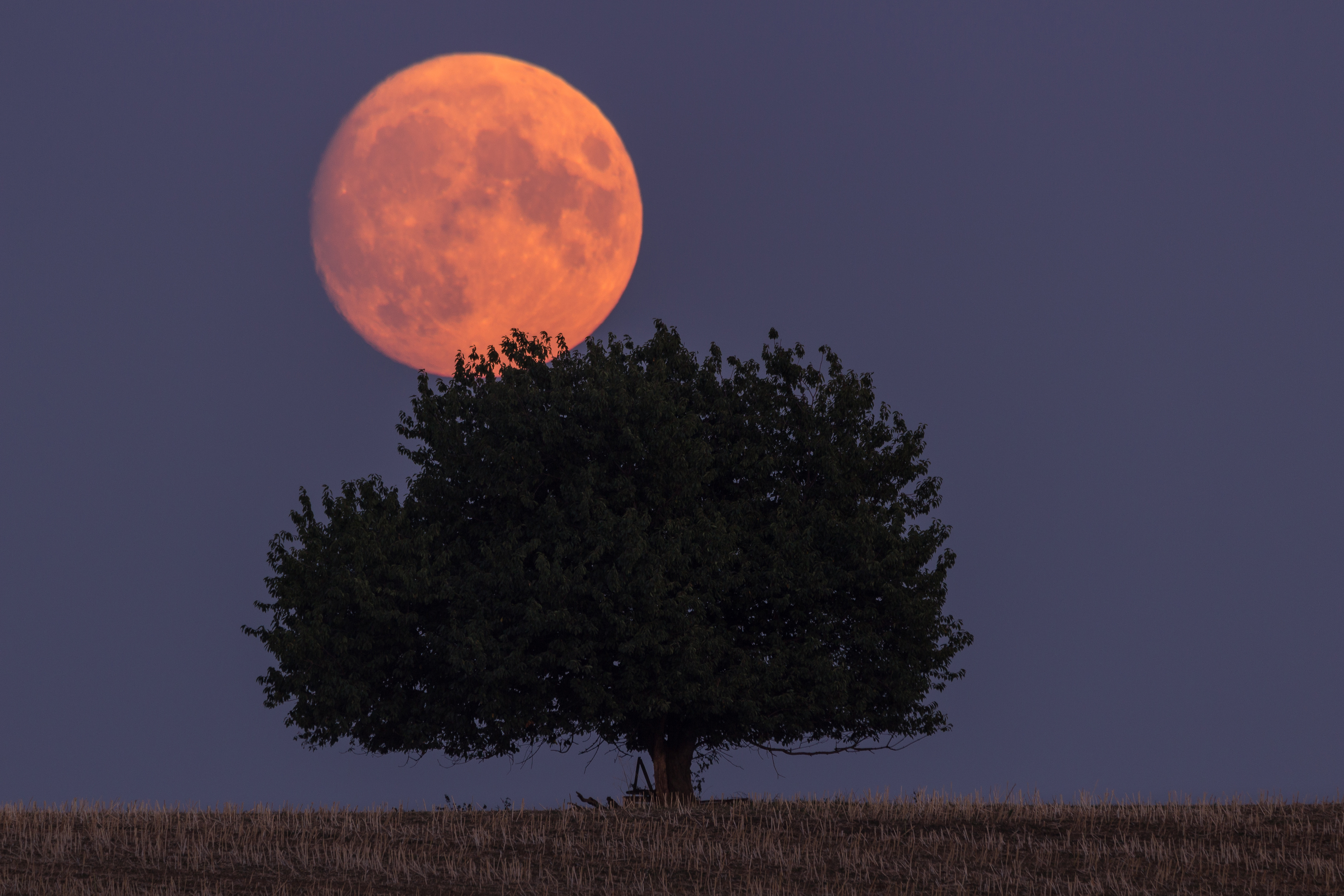 Am 10. August 2022 war der Mond perfekt zu fotografieren und auch die Luftunruhe war um einiges besser als am Tag danach. Es gab auch noch genug Restlicht von der Sonne, die schon langsam am untergehen war. Der Anblick, als der Mond sich genau neben dem Baum (Der ganz einsam auf einer Feldkuppe steht), über die Feldkante schob war einfach wundervoll. Unter dem Baum liegt leider ein zusammengefallener Jägerstand. Man hätte ihn sicher wegstempeln können, aber ich habe ihn gelassen. Er gehört halt dazu.