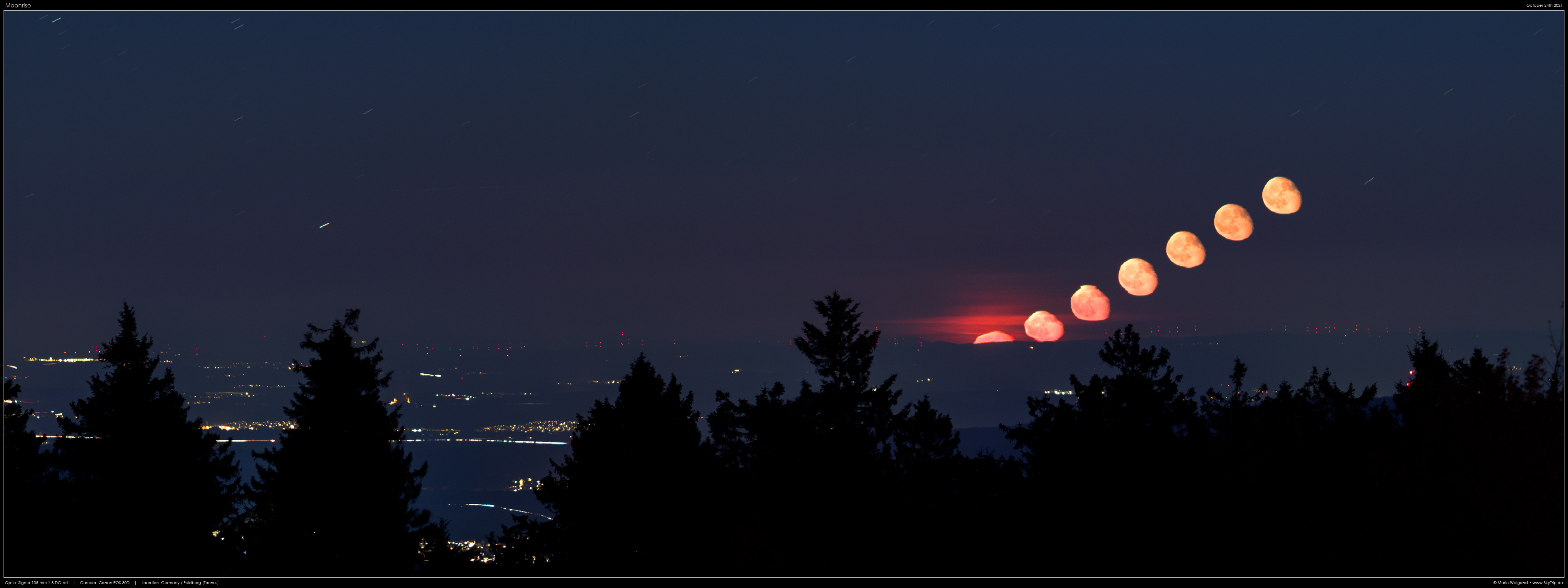Am 24. Oktober 2021 ging der Mond gegen Ende der Astronomischen Dämmerung auf. Da der Himmel schon den Tag über eine hohe Transparenz zeigte, bin ich für die Beobachtung auf den Feldberg im Taunus gefahren. Schon einige Minuten vor dem berechneten Aufgangszeitpunkt machte sich der Mond an der Horizontlinie bemerkbar und erschien zunächst als verzerrter roter Streifen an der Horizontlinie. Danach waren einige interessante Verzerrungen durch die verschiedenen Luftschichten zu sehen. http://www.skytrip.de