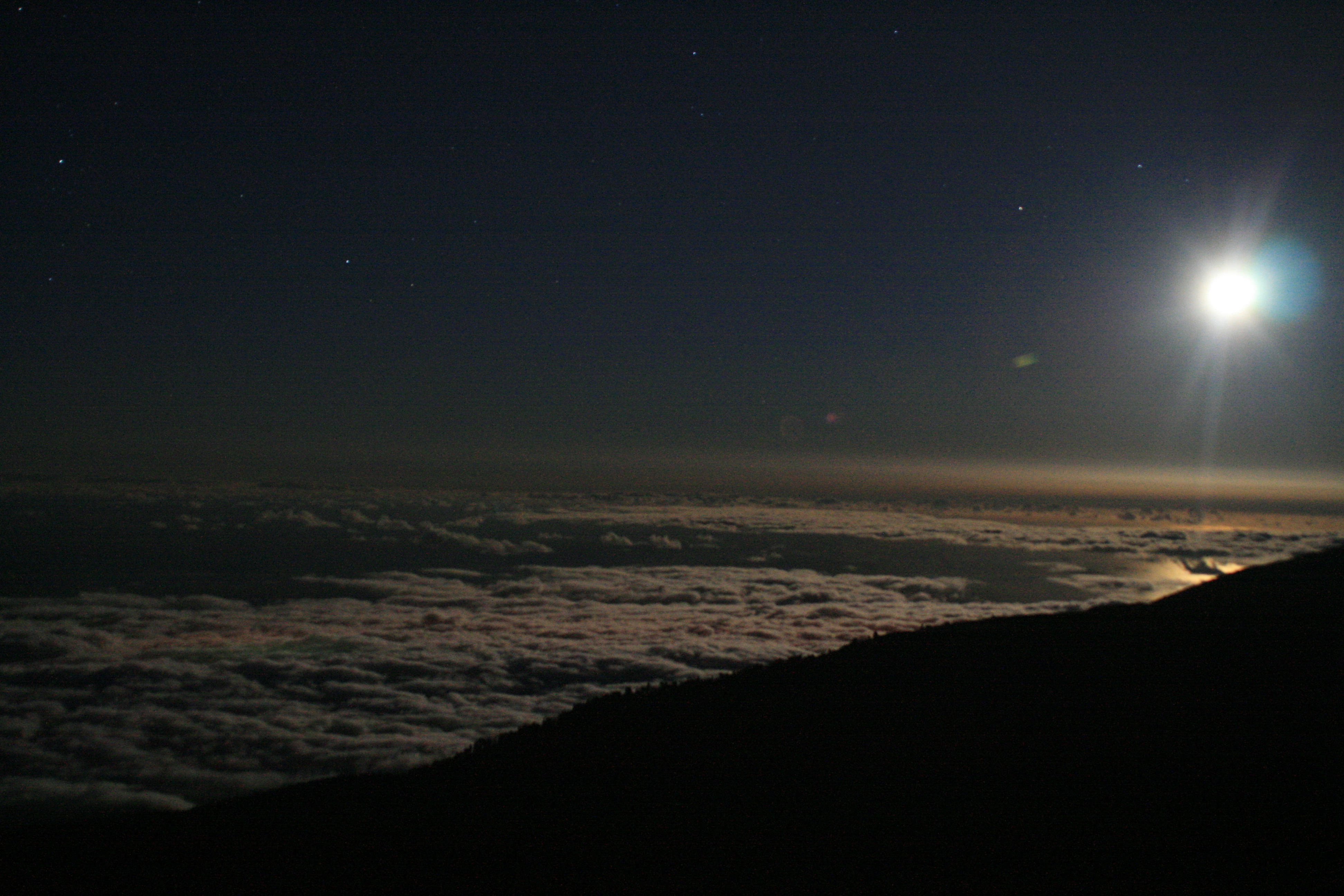 Unmittelbar nach Sonnenuntergang zeigte sich im Nordosten der abnehmende Mond und beleuchtete eindrucksvoll die Passatwolken unter dem Gipfel des Roque de los Muchachos, 2426 m ü.NN. auf La Palma.