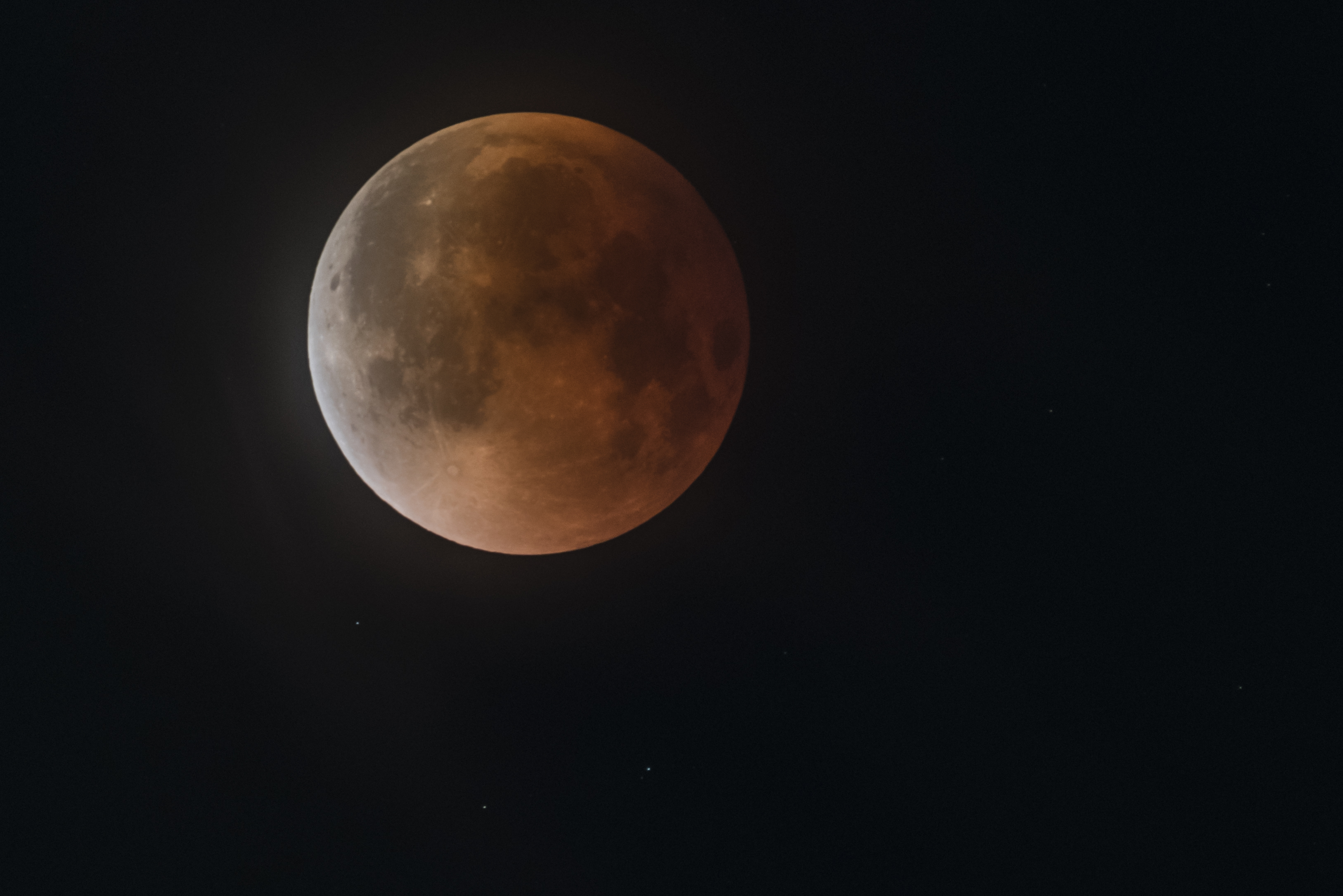 Am 7. September 2025 war eine totale Mondfinsternis zu sehen. Das Wetter war dieses Mal nicht besonders schön und oft war der Mond nur durch Wolken zu sehen. Das Foto zeigt den Mond kurz vor Ende der Totalität. Unterhalb des Mondes sind drei Sterne sichtbar.