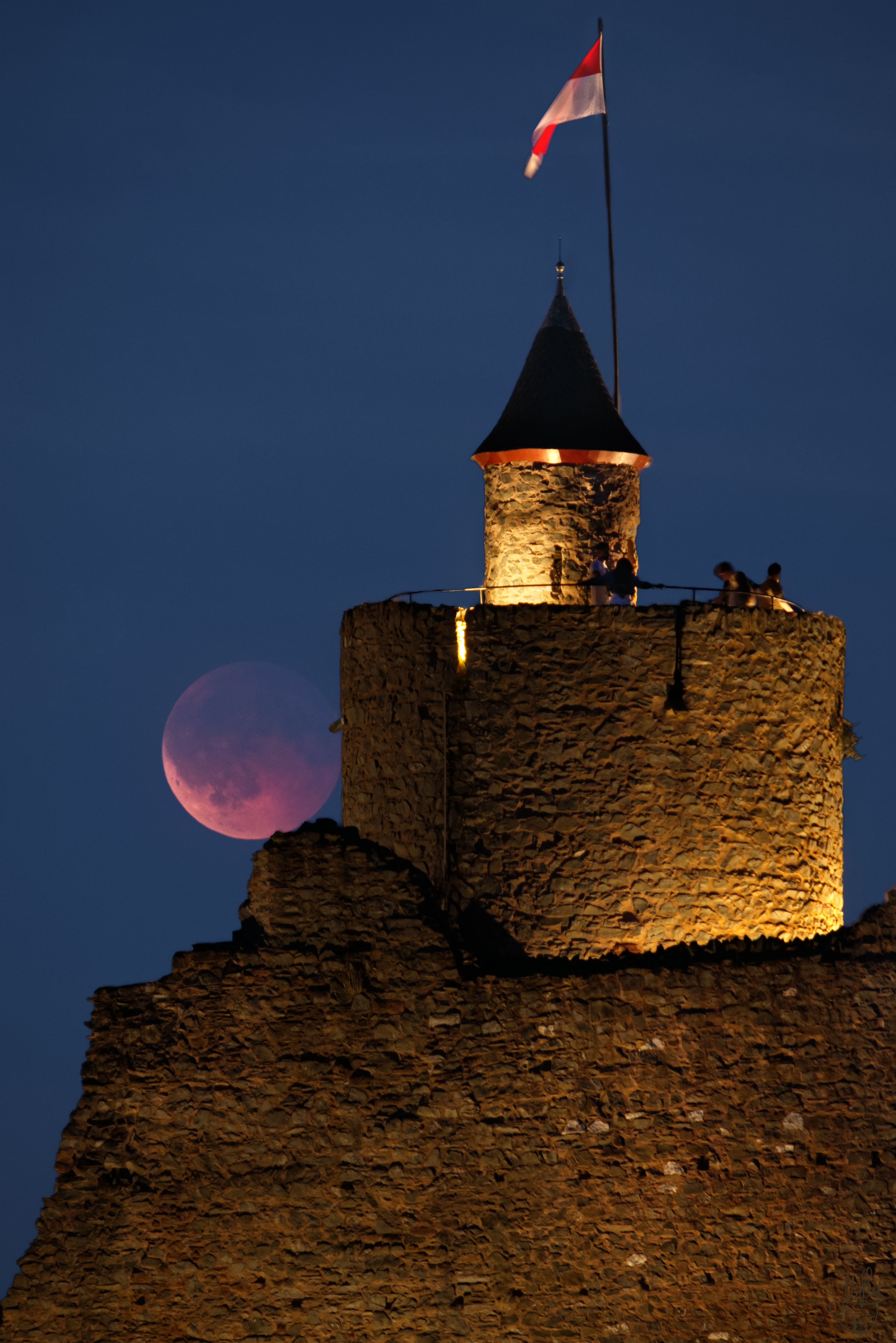 Am Abend des 7. September 2025 zeigt sich der vom Kernschatten der Erde noch vollständig verfinsterte Vollmond neben dem frisch restaurierten Turm der Burgruine Saarburg. Lange hat der Mond gebraucht, um sich gegen die vorhandenen Dunstschichten zu behaupten und am historischen Gemäuer empor zu klettern. Nun lehnt er an der Burg, als wolle er sich ein wenig ausruhen. Die Burganlage thront seit dem Jahr 964 auf dem Schlossberg hoch über der Saar. Damit ist sie eine der ältesten Burganlagen im Westen Deutschlands. Sie ist stolzes Wahrzeichen und Namensgeberin der gleichnamigen Stadt Saarburg in Rheinland-Pfalz. Die Aufnahme ist ein Fokus-Stacking.